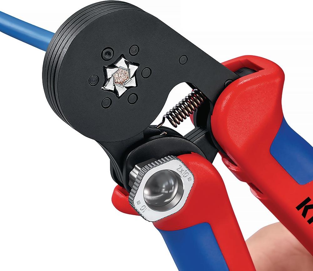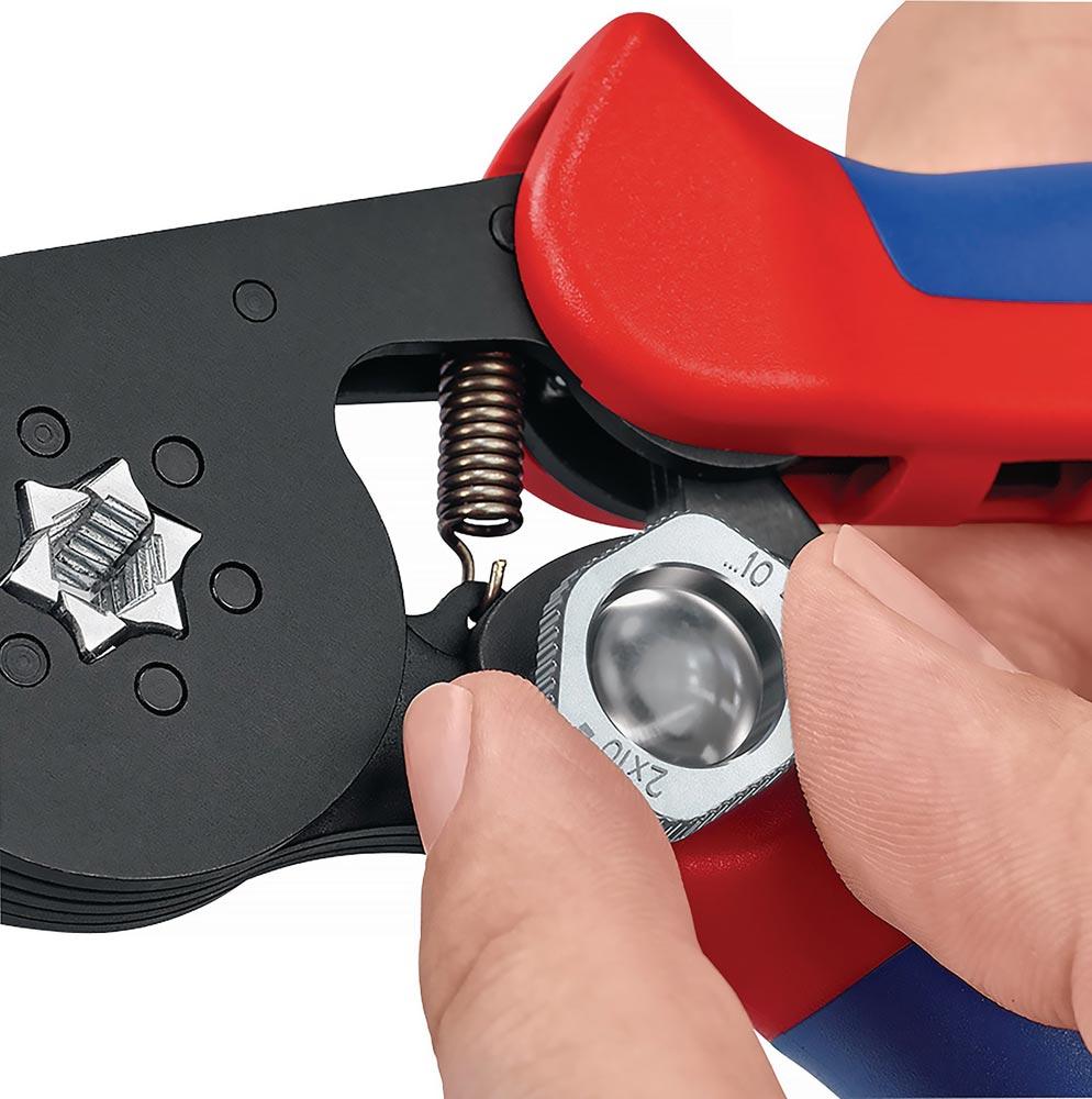 selbsteinstellend · für Aderendhülsen · mit Seiteneinführung · zum Verpressen von Aderendhülsen nach DIN 46228 (Teil 1 + 4) · für beengte Anschlussmaße · mit dem selbsteinstellenden Sechskant-Crimpprofil werden Aderendhülsen einfach, schnell und zuverlässig vercrimpt · Chrom-Vanadin-Elektrostahl in Sondergüte, ölgehärtet · Sechskantcrimpung, für Twin-Aderendhülsen bis 2 x 10 mm², mit Umschalthebel für 16 mm²