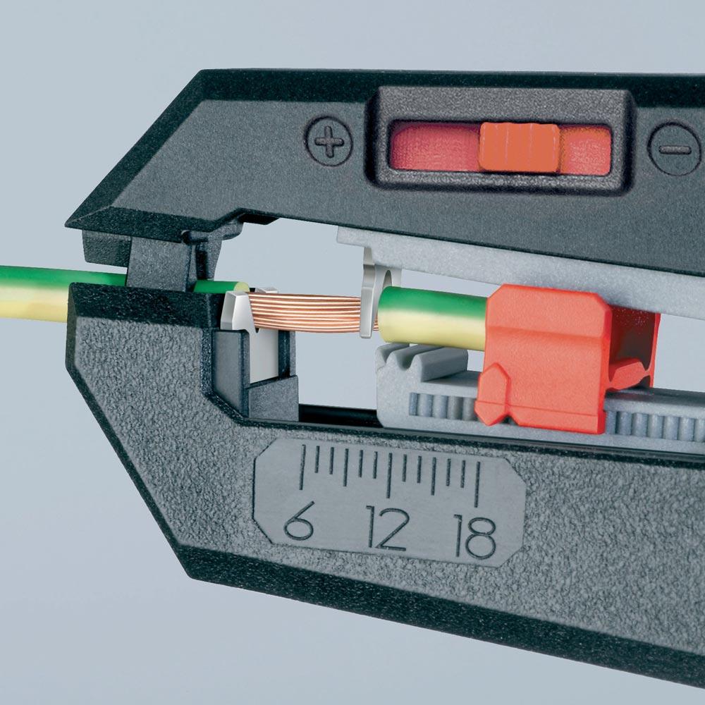 schlanke Kopfform zum Abisolieren in beengten Verhältnissen · für ein-, mehr- und feindrähtige Leiter mit Standardisolation · passt sich selbsttätig den verschiedenen Leiterquerschnitten an · mit Drahtabschneider für Kupfer und Alu-Leiter bis max. 2,5 mm² · Gehäuse: aus glasfaserverstärktem Kunststoff · Messer: Spezial-Werkzeugstahl, ölgehärtet, auswechselbar