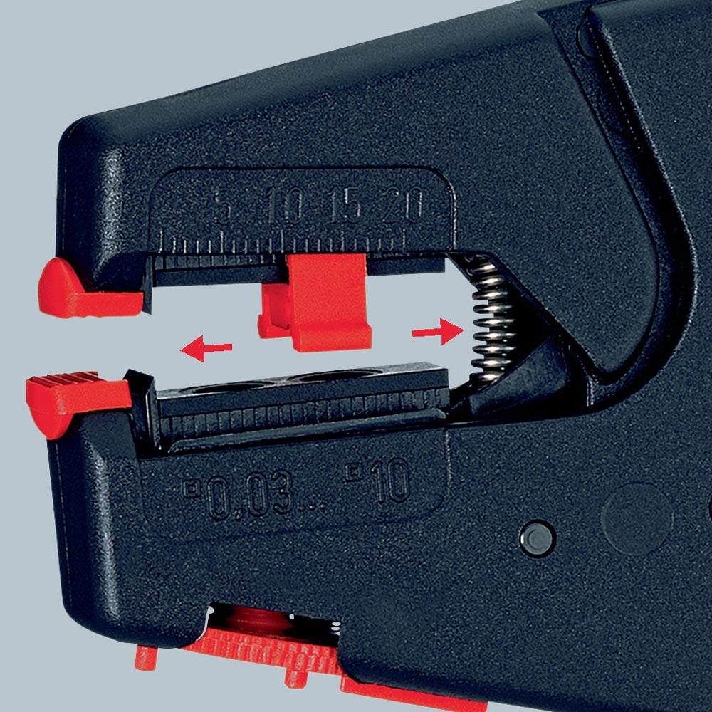 selbsteinstellend · für ein-, mehr- und feindrähtige Leiter mit Kunststoff- oder Gummiisolation · Drahtschneider für Cu- und Al-Leiter mehrdrähtig bis 10 mm² und eindrähtig bis 6 mm² · Messer und Kunststoff-Klemmbacken leicht auswechselbar · Gehäuse: aus glasfaserverstärktem Kunststoff · Messer: Spezial-Werkzeugstahl, ölgehärtet