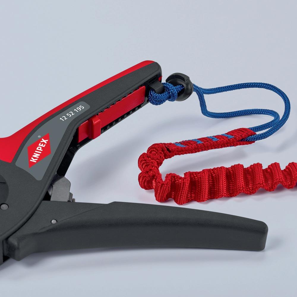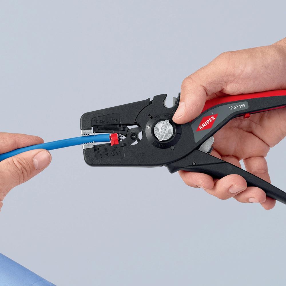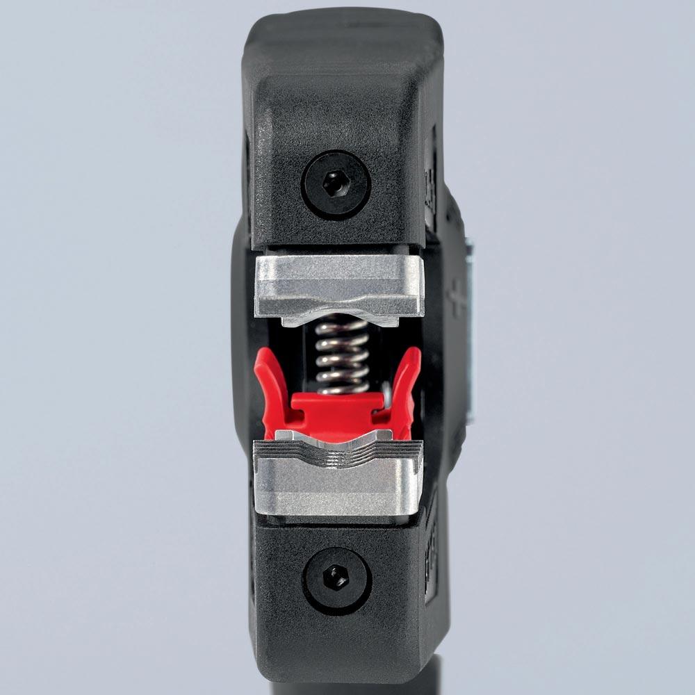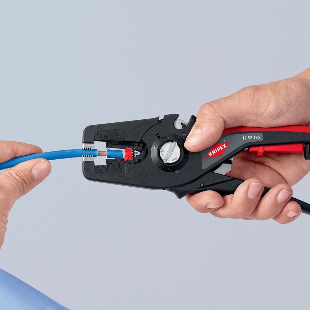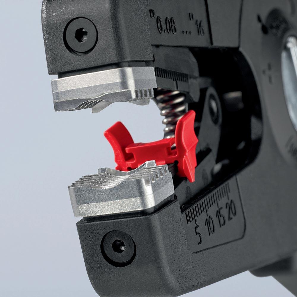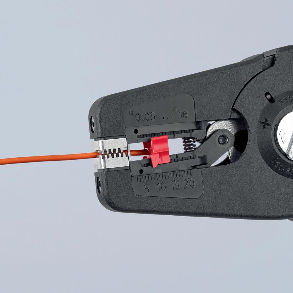 selbsteinstellend · einfaches, präzises Abisolieren und Schneiden von feindrähtigen bis massiven Rundkabeln im großen Kapazitätsbereich von 0,08 bis 16mm² mit nur einer Zange · Kabelschneider bis 16 mm² · bei Bedarf kann optional feinjustiert werden, z. B. in Extrembereichen · guter Grip durch halbrunde Metall-Haltebacken mit Kammprofil · parabelförmige Abisoliermesser für exakten Schnitt · leicht auswechselbare Messerkassette · einstellbarer Längenanschlag · Beschriftungsfeld zur Individualisierung · Gehäuse: aus glasfaserverstärktem Kunststoff · Messer: Spezial-Werkzeugstahl, ölgehärtet