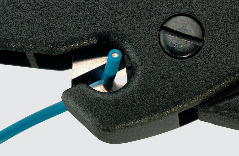 zum Abisolieren und Schneiden von feindrähtigen und massiven Leitern mit PVC-Isolation · verarbeiten von Mehrfachleitern · bei dünnen Flachbandleitern sogar mehrere Leiter in einem Arbeitsgang · doppelt isolierte Kabel in 2 Arbeitsgängen ohne besondere Einstellung · automatisches Öffnen der Klemmbacken nach dem Abisoliervorgang · sie verfügen über einen innenliegenden Seitenschneider bis max. 6 mm² · Gehäuse aus glasfaserverstärktem Kunststoff · die Griffschalen sind abnehmbar · Messerkasetten austauschbar