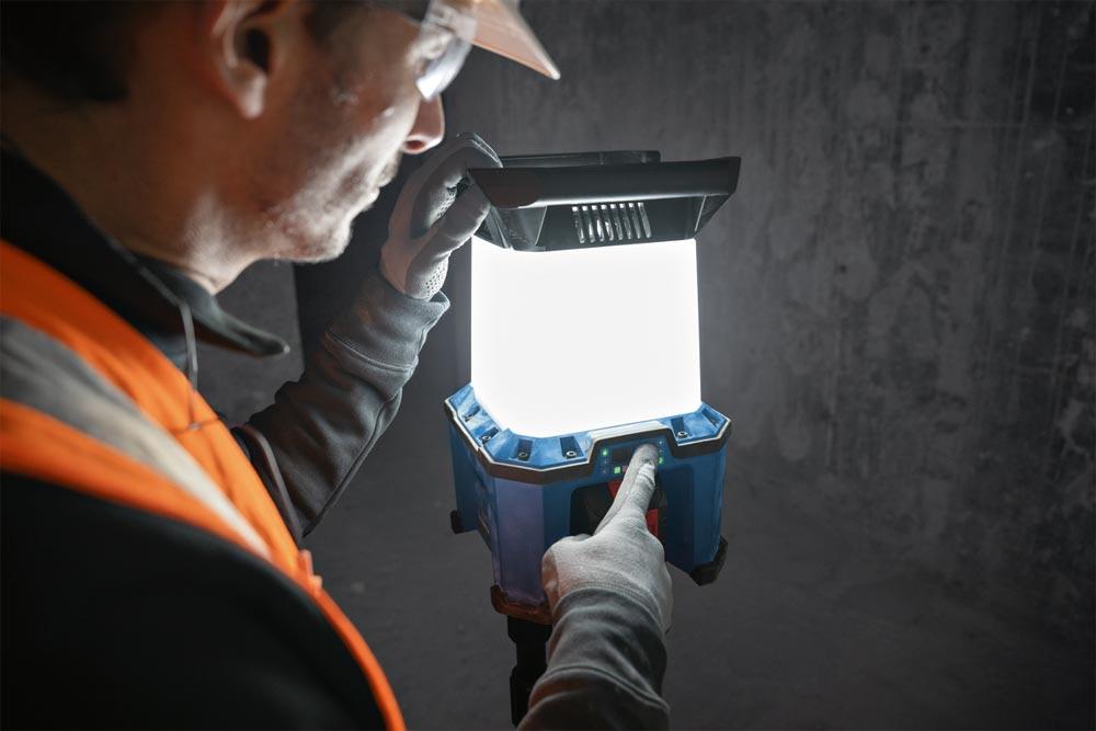 Akku-Bauleuchte für den Einsatz mit oder ohne Kabel ∙ 3 Helligkeitsstufen und 180°/360°-Modi ∙ Praktisches Schnellladen per USB-C® ∙ HMI zeigt den Ladestand des Akkus, die Helligkeitseinstellung und die 180°/360°-Funktion an ∙ Optimale Lichtverteilung dank des großen, robusten Hakens im Fuß und die Stativmontageoptionen