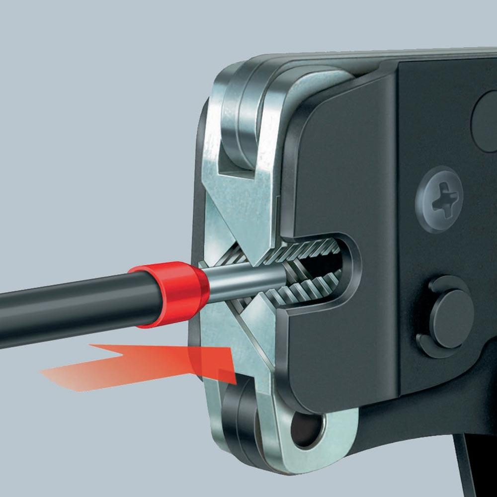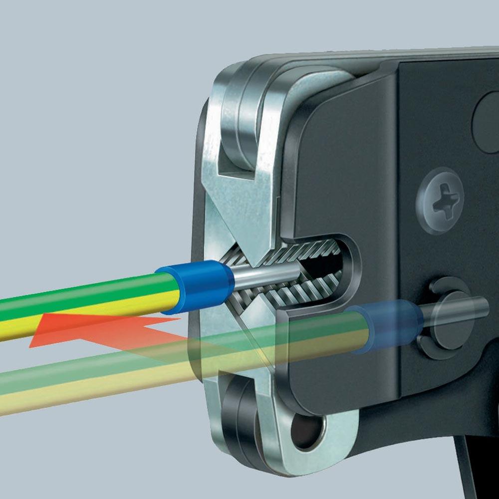 selbsteinstellend · für Aderendhülsen · mit Fronteinführung · zum Verpressen von Aderendhülsen nach DIN 46228 (Teil 1 + 4) · Vierkantcrimpung für stets optimale Kontaktflächen ungeachtet der Positionierung im Klemmanschluss · handliche und leichte Ausführung · ermüdungsarmes Arbeiten durch hohe Übersetzung · Chrom-Vanadin-Elektrostahl in Sondergüte, ölgehärtet