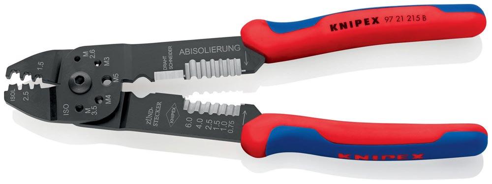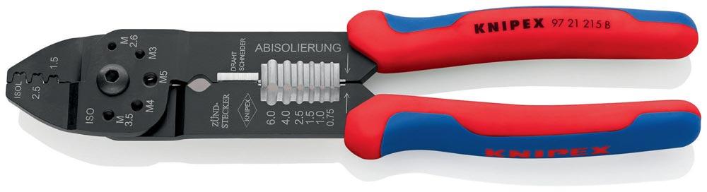 zum Kabelschneiden, Abisolieren von Drähten und Quetschen von isolierten und unisolierten Kabelschuhen und Steckverbindern und offenen Stechverbindern · mit Gewindelöchern zum Abschneiden von Cu- und Ms-Gewindestiften M 2,6 / 3 / 3,5 / 4 / 5 · aus hochfestem Spezialstahl