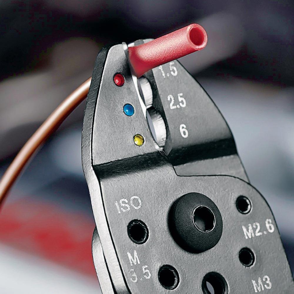 zum Kabelschneiden, Abisolieren von Drähten und Quetschen von isolierten und unisolierten Kabelschuhen und Steckverbindern und offenen Stechverbindern · mit Gewindelöchern zum Abschneiden von Cu- und Ms-Gewindestiften M 2,6 / 3 / 3,5 / 4 / 5 · aus hochfestem Spezialstahl