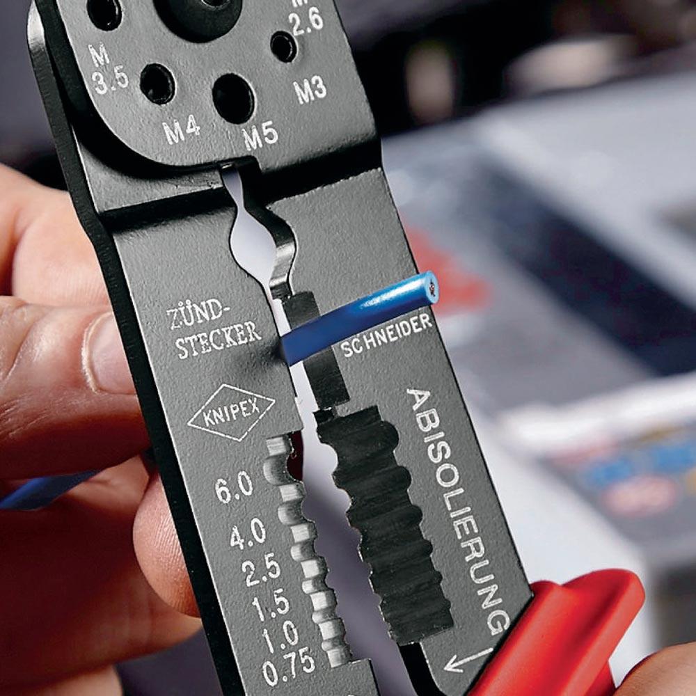 zum Kabelschneiden, Abisolieren von Drähten und Quetschen von isolierten und unisolierten Kabelschuhen und Steckverbindern und offenen Stechverbindern · mit Gewindelöchern zum Abschneiden von Cu- und Ms-Gewindestiften M 2,6 / 3 / 3,5 / 4 / 5 · aus hochfestem Spezialstahl