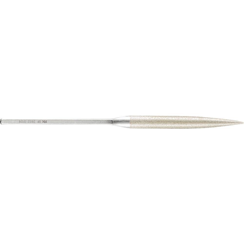 diamantbelegte Präzisionsfeile · geeignet für die Bearbeitung von gehärteten Stählen, Hartmetall, Keramik, Glas, Ferrit, Nickel- und Titanbasislegierungen sowie faserverstärkten Kunststoffen · Diamanthandyfeilen werden aufgrund ihres geschmiedeten Schaftes ohne Heft eingesetzt · Belaglänge 100 mm