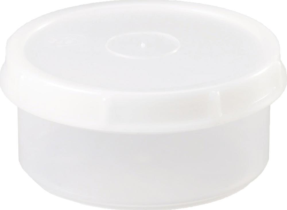 rund · mit Schraubdeckel · Polypropylen · lebensmittelbeständig · bruchsicher und formstabil · gute Beständigkeit gegen Fette, Harze, Öle, Säuren und Laugen · staubdichter Schraubverschluss · Temperaturbeständigkeit von -20 °C bis +80 °C · geeignet für Spülmaschine, Mikrowelle und Tiefkühltruhe · naturfarben · VE=5