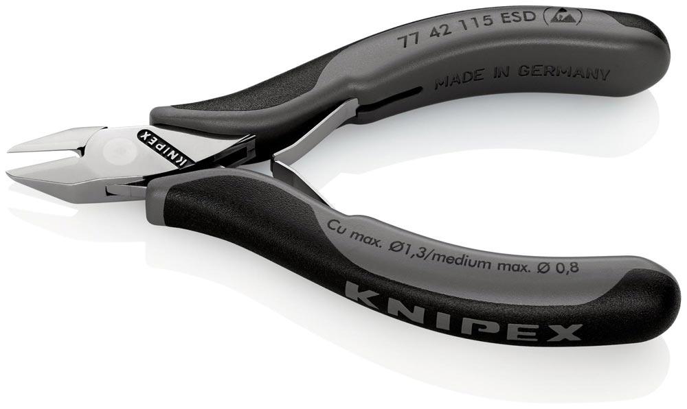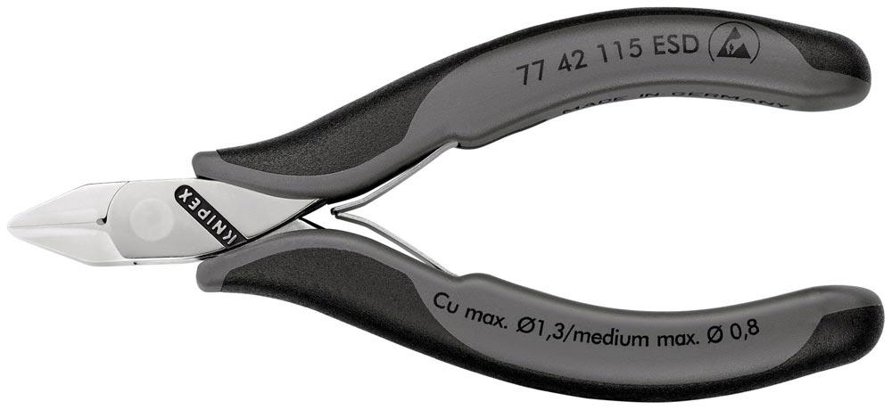 ESD · für feinste Schneidarbeiten z. B. in Elektronik und Feinmechanik · durchgestecktes, spielfreies Gelenk · Schneiden zusätzlich induktiv gehärtet, Schneidenhärte ca. 62 HRC · mit Öffnungsfeder · Spezial-Werkzeugstahl in Sondergüte geschmiedet, mehrstufig ölgehärtet · elektrisch ableitend - dissipativ