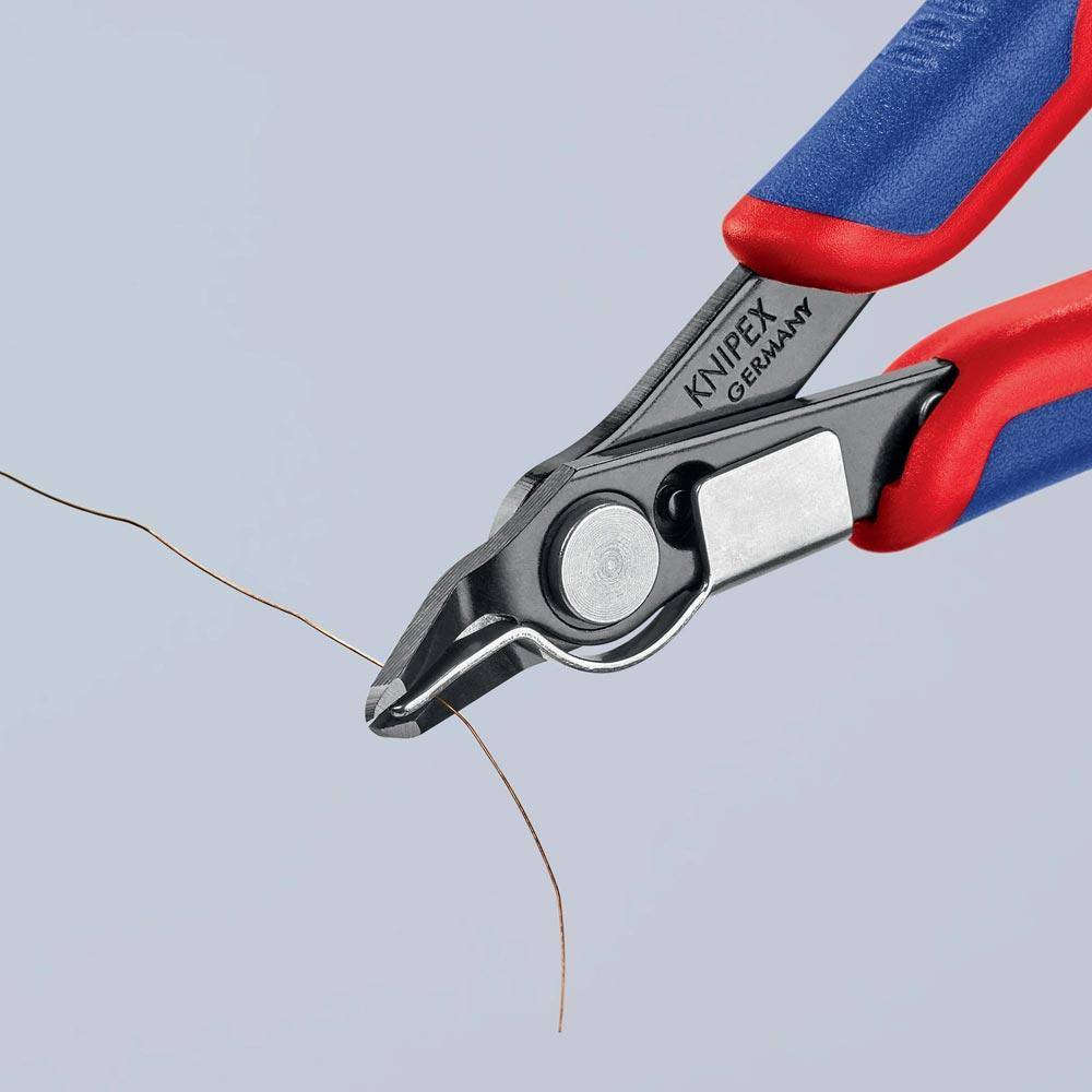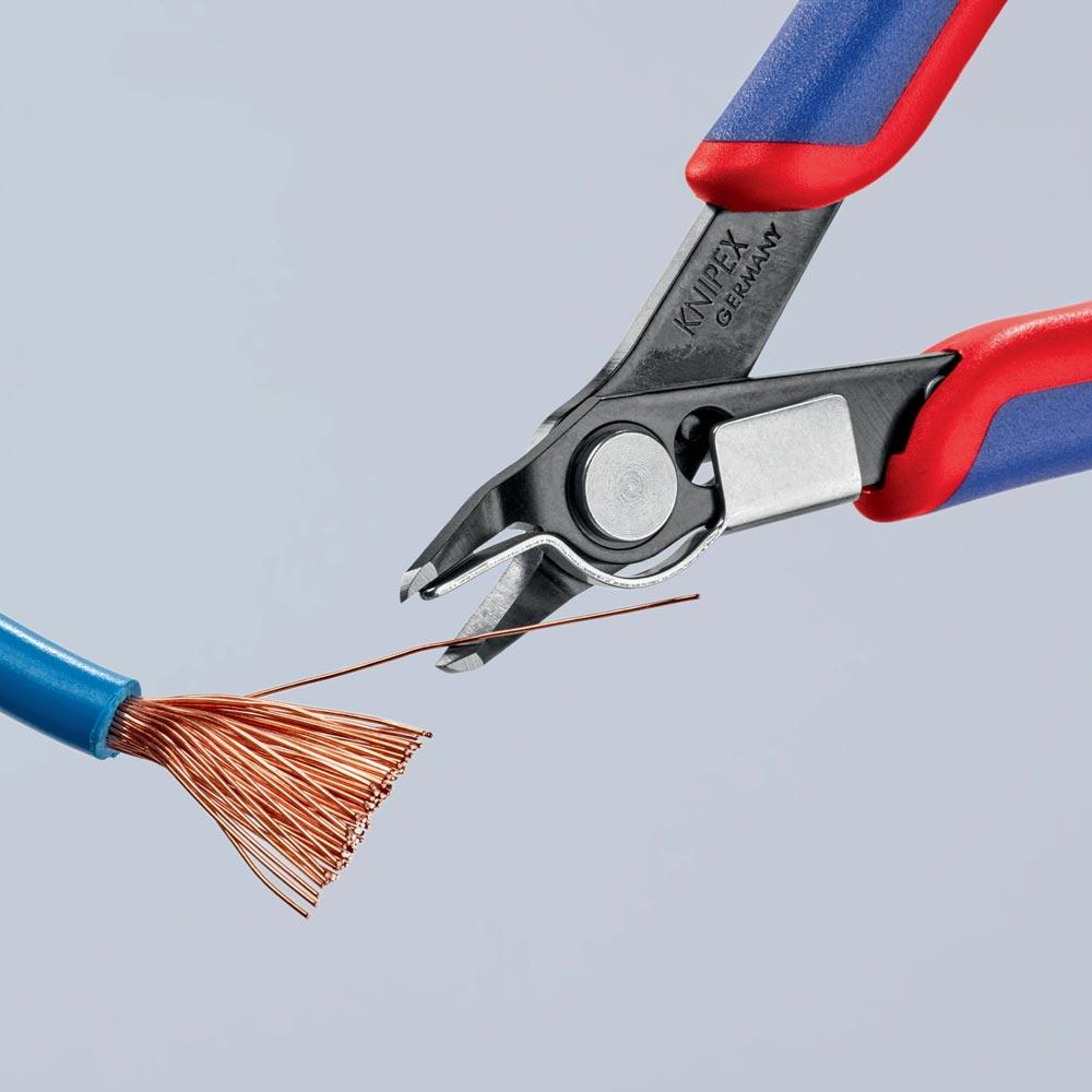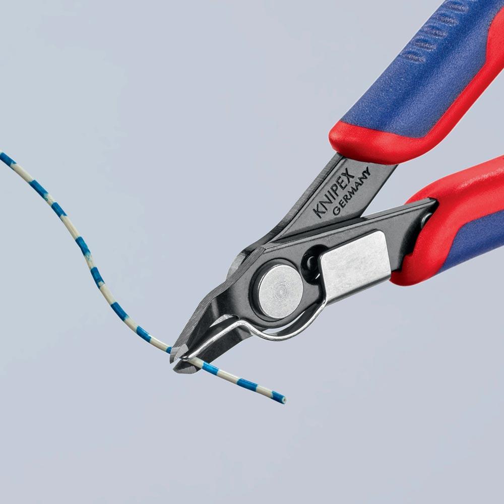 für feinste Schneidarbeiten z. B. in Elektronik und Feinmechanik · geschliffene, sehr scharfe Schneiden · Gelenk mit Edelstahl-Niet · Schneiden zusätzlich induktiv gehärtet · mit Öffnungsfeder und Öffnungsbegrenzung · Spezial-Werkzeugstahl