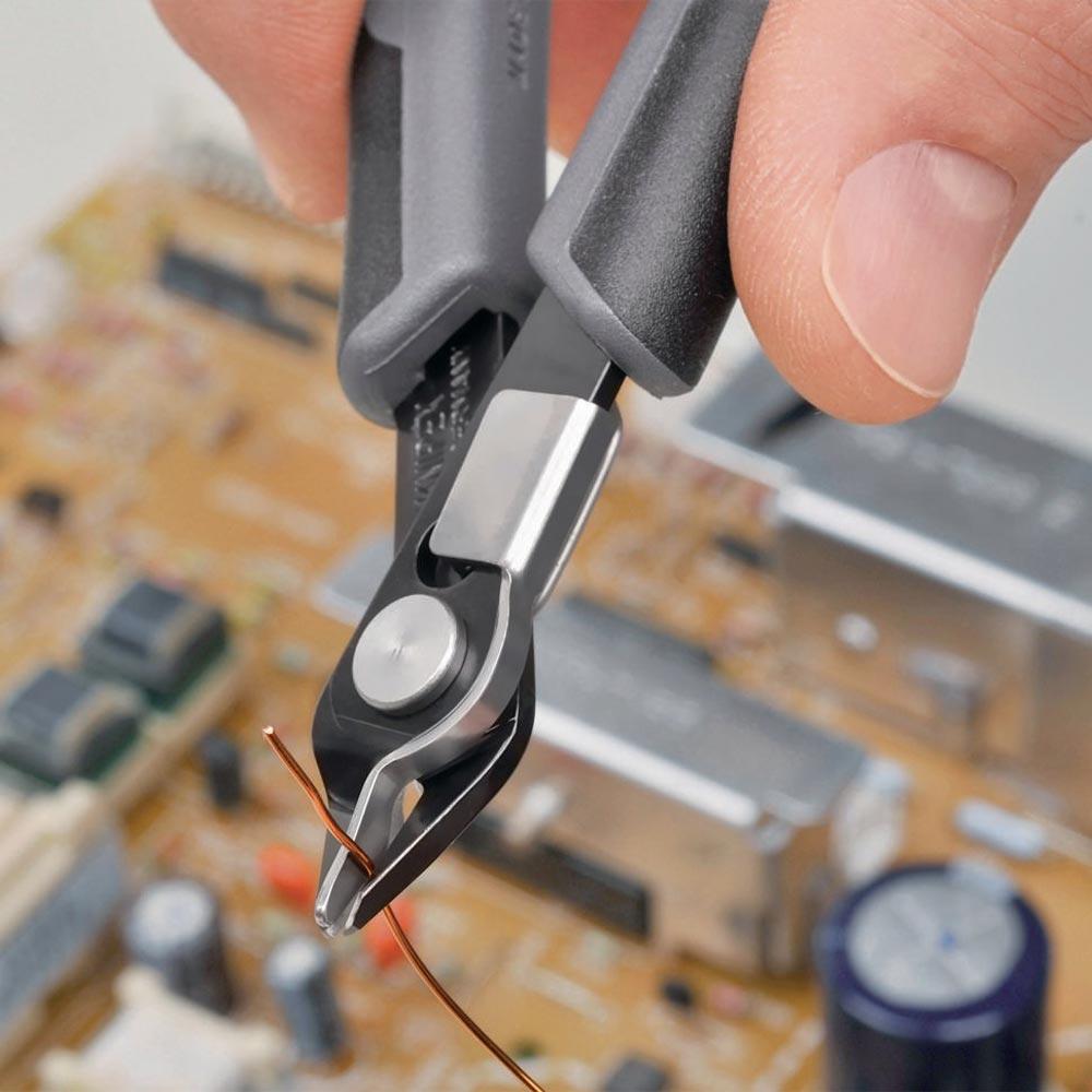 ESD · für feinste Schneidarbeiten z. B. in Elektronik und Feinmechanik · geschliffene, sehr scharfe Schneiden · Gelenk mit Edelstahl-Niet · Schneiden zusätzlich induktiv gehärtet · mit Öffnungsfeder und Öffnungsbegrenzung · Spezial-Werkzeugstahl · elektrisch ableitend - dissipativ