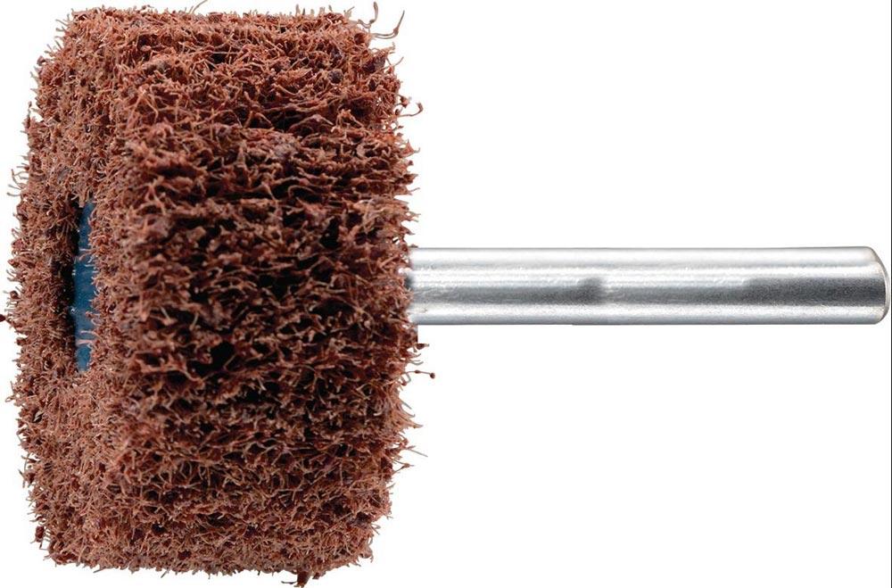 Korund A · Anordnung des Vliesmaterials radial in Lamellenform, wobei bei diesen Polierkörpern die Lamellen extrem dicht gepackt sind und dadurch eine hohe Standzeit erreicht wird · Schaft-Ø 6 mm
