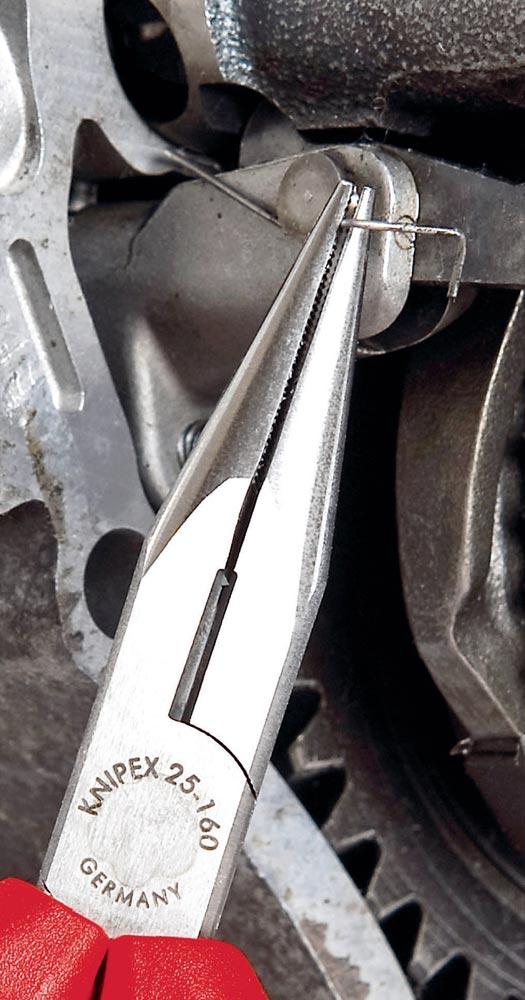 mit Schneide (Radiozange) · gerade, flach-runde Backen · Greifflächen gezahnt · Schneiden zusätzlich gehärtet, Schneidenhärte ca. 61 HRC · Vanadin-Elektrostahl, geschmiedet, mehrstufig ölgehärtet