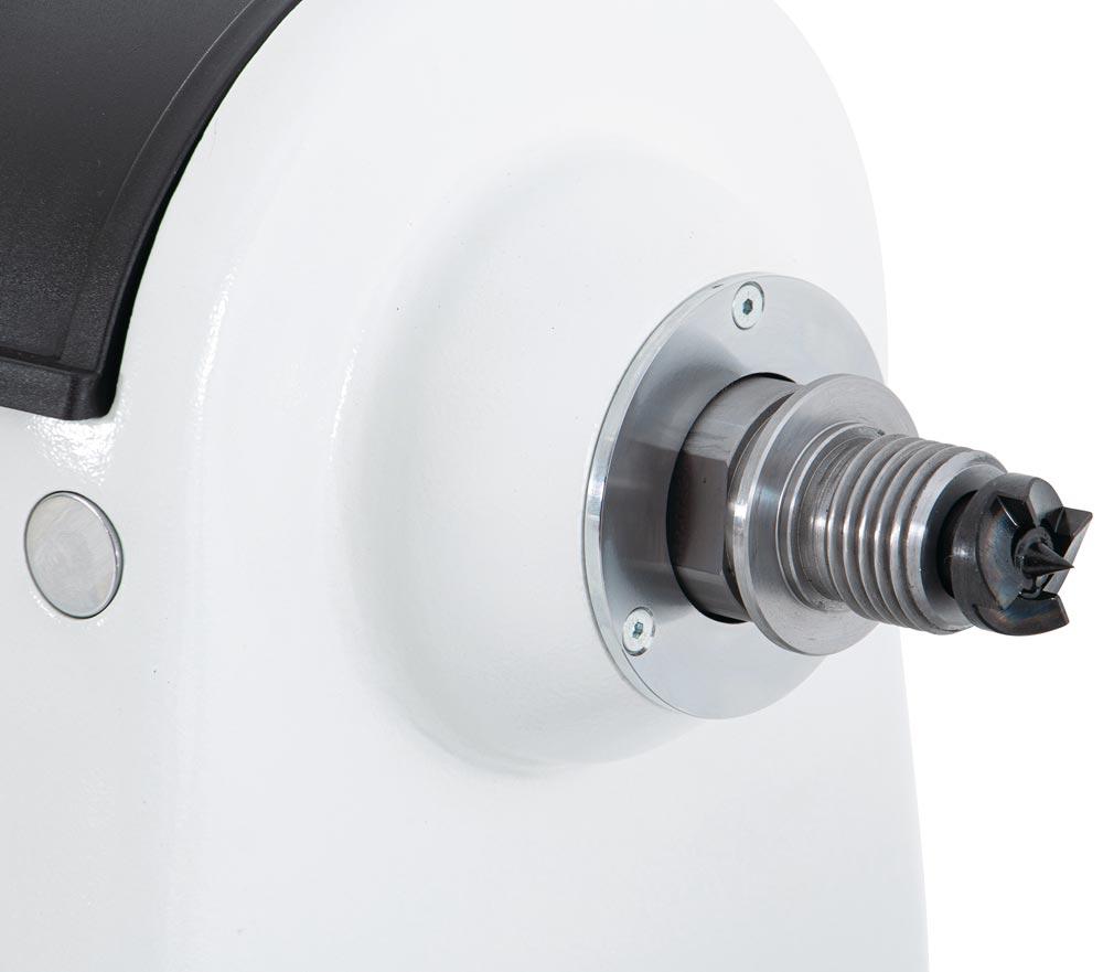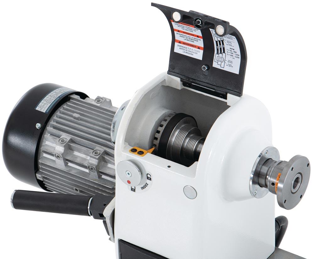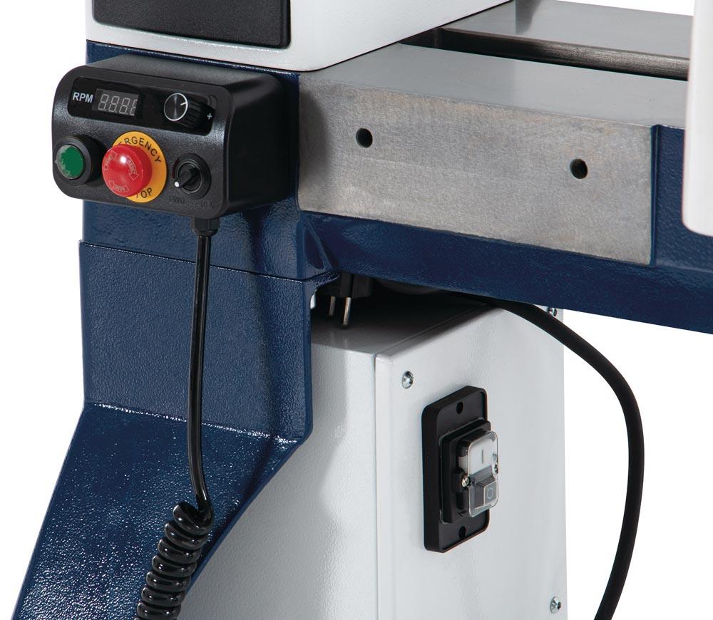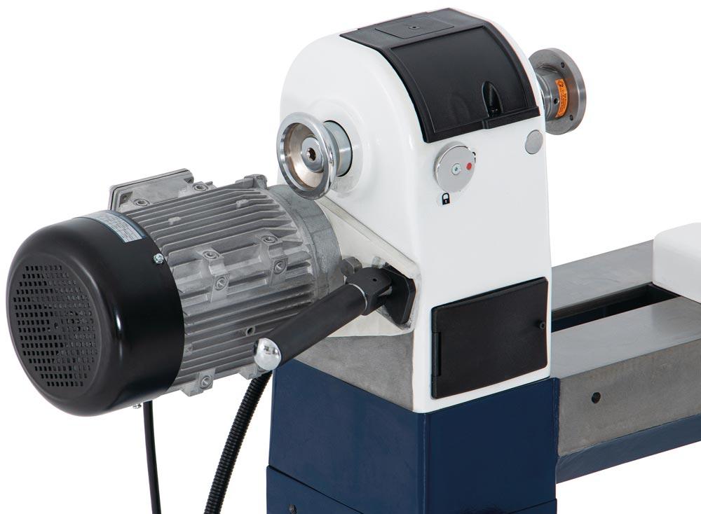 Drechselbank mit stufenloser Drehzahlverstellung über Frequenzumrichter ∙ Bankbett aus massivem Grauguss für hohe Laufruhe ∙ Robuster Reitstock mit Trapezgewinde ∙ Drehbarer Spindelstock ∙ ASR-Ablaufsicherungsnut für maximale Sichereit bei der Spannmittelbefestigung ∙ Flexibles Arbeiten mit mobiler Bedienbox mit Magnethalterung ∙ Bedienbox mit digitaler Drehzahlanzeige und Umschaltung des Rechts-Linkslauf ∙ 24-Schritt-Teileinrichtung der Spindel zur exakten Bearbeitung des Werkstückes