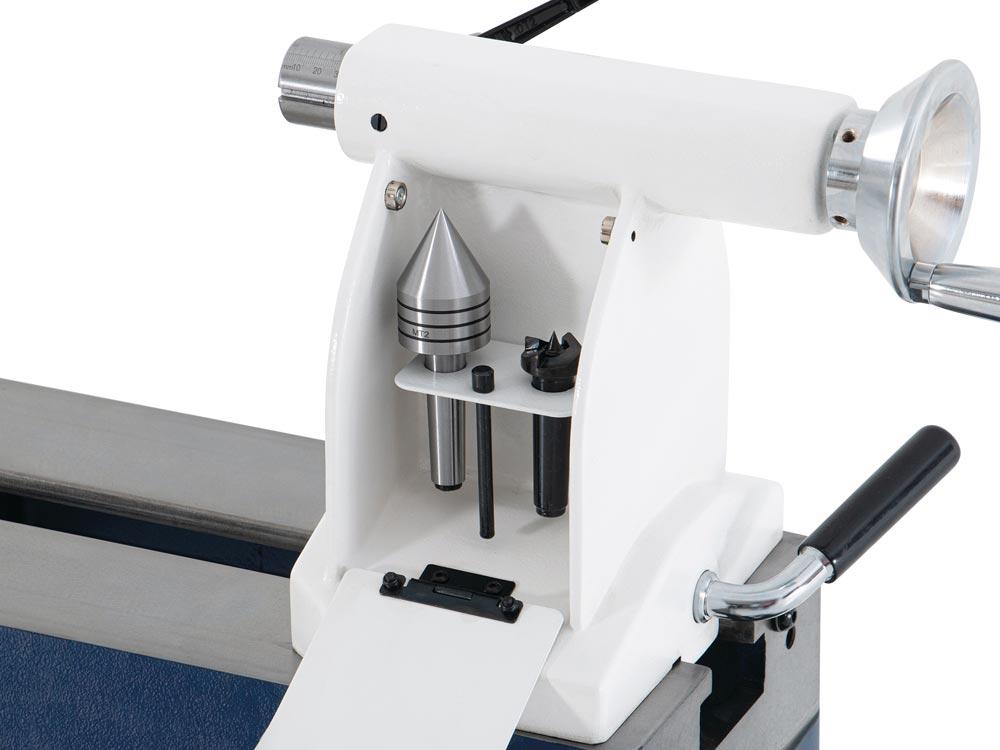 Lieferumfang: Werkzeugauflage 300 mm, Planscheibe 80 mm, Vierzackmitnehmer, Mitlaufkörner, langer und kurzer Auswurfstab, je 2 Spannschlüssel 46 - 38 mm, je 1 Spannschlüssel 8 - 10 und 17 - 19 mm, 1 Innensechskantschlüssel-Satz 2,5-10 mm 6tlg.
