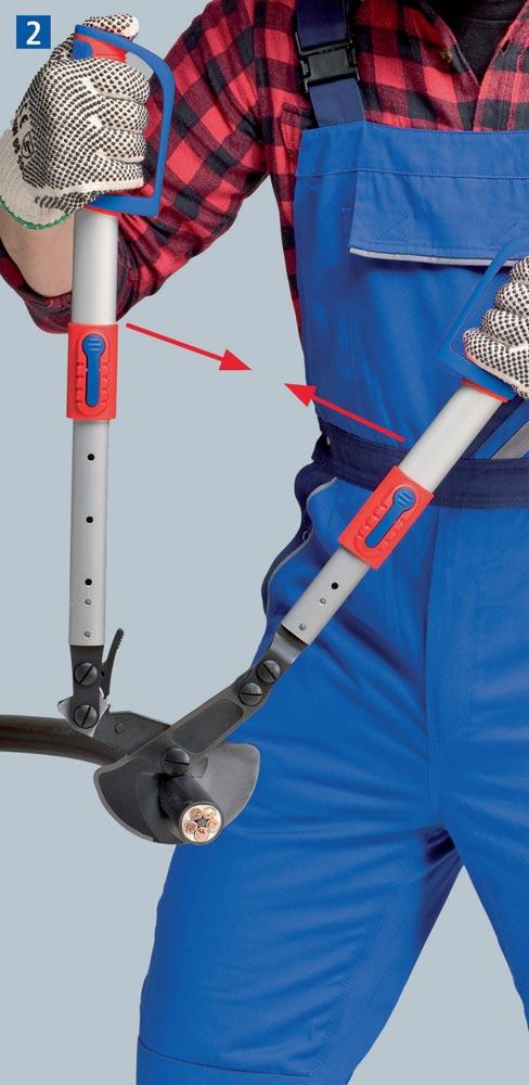 mit verstell- und abwinkelbaren Teleskopschenkeln · für Kabeldurchmesser bis 38 mm · auch geeignet zum Arbeiten in beengten Arbeitsbereichen · komfortables Arbeiten durch Ratschenprinzip und geringes Gewicht · ausziehbar bis auf 770 mm für maximalen Hebel bei großen Kabeldurchmessern · einschiebbar auf 570 mm für minimalen Platzbedarf beim Transport · auswechselbarer Schneidkopf · Schneidkopf: Spezial-Werkzeugstahl in Sondergüte, ölgehärtet