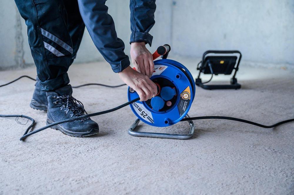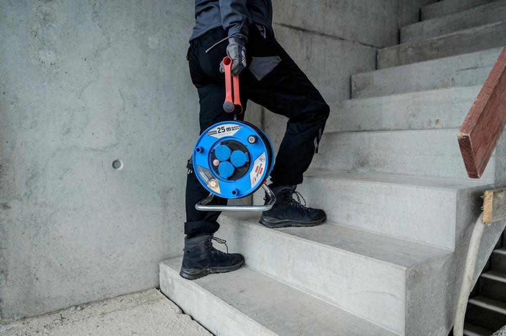Die Garant IP44 Gewerbe-/Baustellen-Kabeltrommel mit 25m Kabellänge in der Farbe blau von Brennenstuhl überzeugt durch ihre Qualität und Sicherheit in allen Bereichen. Die Kabeltrommel eignet sich ideal für den Baustelleneinsatz und den Einsatz im Freien. Sie überzeugt außerdem durch folgende Eigenschaften Innovativer Tragegriff ″cablepilot″ für die perfekte Kabelführung. Pendelt auf beiden Seiten und ermöglicht bequemes Tragen und Aufhängen RN-Kabel ist zugelassen für erschwerte Baubedingungen nach VDE 0100 Teil 704 Mit Drehgriff für komfortables Aufrollen Schutzart IP44 Kabellänge 25m Kabelbezeichnung H07RN-F 3G1,5 Kabelqualität Gummi-Neopren Kabelfarbe Schwarz Trommeldurchmesser 240mm · Gummikabel H07RN-F