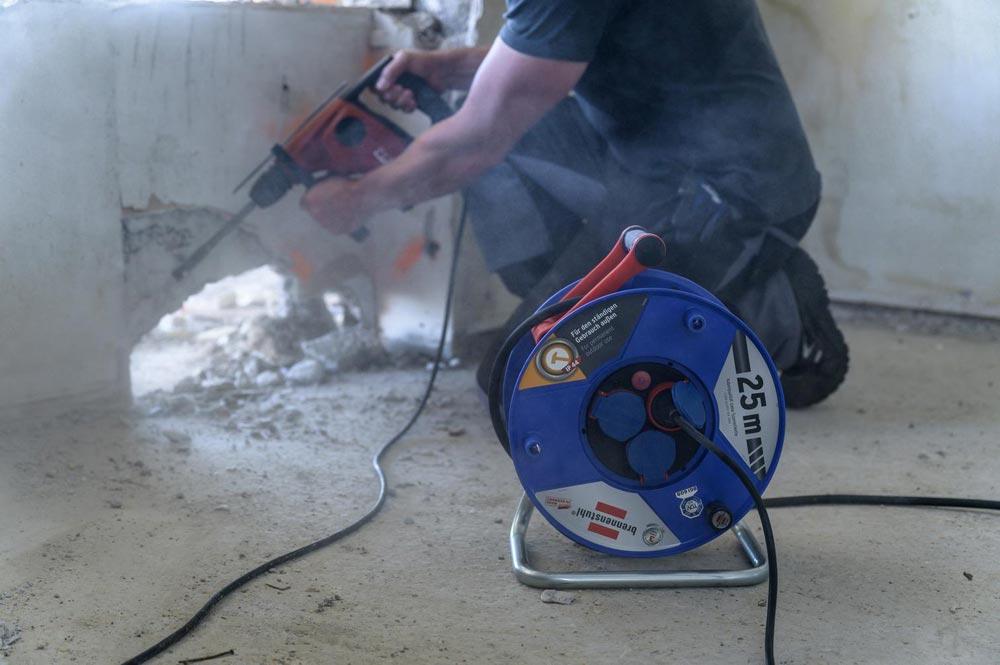 Die Garant IP44 Gewerbe-/Baustellen-Kabeltrommel mit 25m Kabellänge in der Farbe blau von Brennenstuhl überzeugt durch ihre Qualität und Sicherheit in allen Bereichen. Die Kabeltrommel eignet sich ideal für den Baustelleneinsatz und den Einsatz im Freien. Sie überzeugt außerdem durch folgende Eigenschaften: Innovativer Tragegriff ″cablepilot″ für die perfekte Kabelführung. Pendelt auf beiden Seiten und ermöglicht bequemes Tragen und Aufhängen RN-Kabel ist zugelassen für erschwerte Baubedingungen nach VDE 0100 Teil 704 Mit Drehgriff für komfortables Aufrollen Schutzart IP44 Kabellänge 25m Kabelbezeichnung H07RN-F 3G2,5 Kabelqualität Gummi-Neopren Kabelfarbe Schwarz Trommeldurchmesser 290 mm · Gummikabel H07RN-F