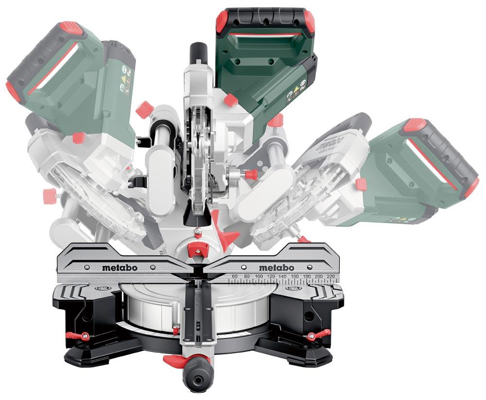 Säge ∙ Maximale Flexibilität beim Sägen durch beidseitig drehbaren Tisch und beidseitig neigbaren Sägekopf ∙ Variable Drehzahl für erweitertes Einsatzspektrum, z.B. zum Sägen von Alu-Profilen und Kunststoffen ∙ Effektive Spanabsaugung über integrierten Spänefangtrichter ∙ Sanftanlauf für lange Lebensdauer von Motor und Getriebe ∙ Schnelle und präzise Einstellung gängiger Winkel über Rastpunkte ∙ Ausziehbare Tischverbreiterungen, auch abnehmbar zum Unterlegen extrem langer Werkstücke ∙ Schnellspannzwinge zur sicheren Fixierung des Werkstücks von oben oder von vorne ∙ Tiefenanschlag zur einfachen Herstellung von Nuten