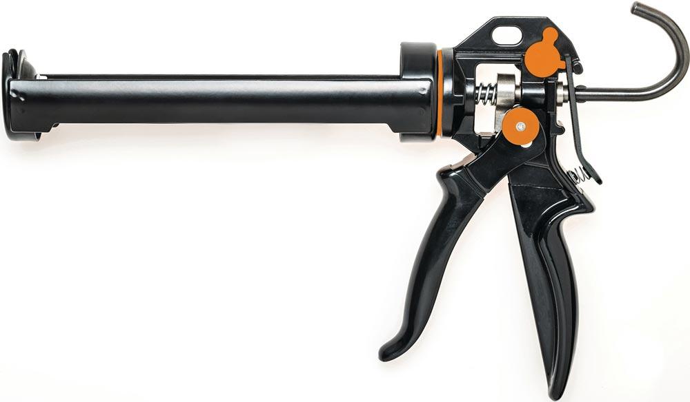 stabiles Profi-Werkzeug mit drehbarer Schale und extra starkem Delta-Schubklotz · wählbares Übersetzungsverhältnis: 25:1 oder 12:1 · aktivierbare Nachlaufstopp-Funktion · gummierter, abrutschsicherer Griff und Abzug · Schub- und Antriebsteile mit korrosionsgeschützter Speziallegierung · integrierter Leiterhaken · auch für zähe Massen geeignet · für alle genormten Kartuschen (310 ml)