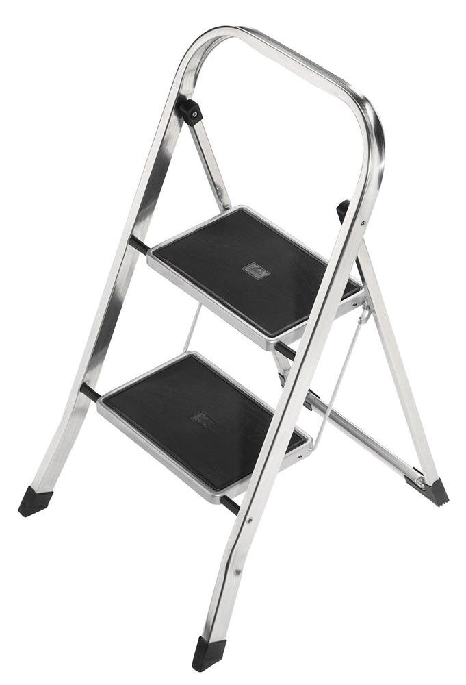 schmal zusammengeklappbar · stabile Aluminium-Holme · Stahl-Stufen silbergrau-beschichtet, mit schwarzem Anti-Rutsch-Belag · breite Stufen für hohen Standkomfort · Sicherheitsverriegelung · max. Gesamtbelastung 150 kg · geringes Gewicht · Zusammengeklappt nur 50 mm schmal