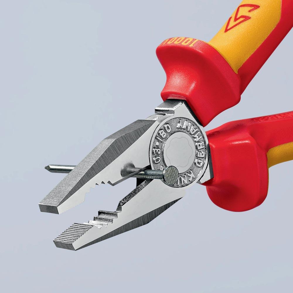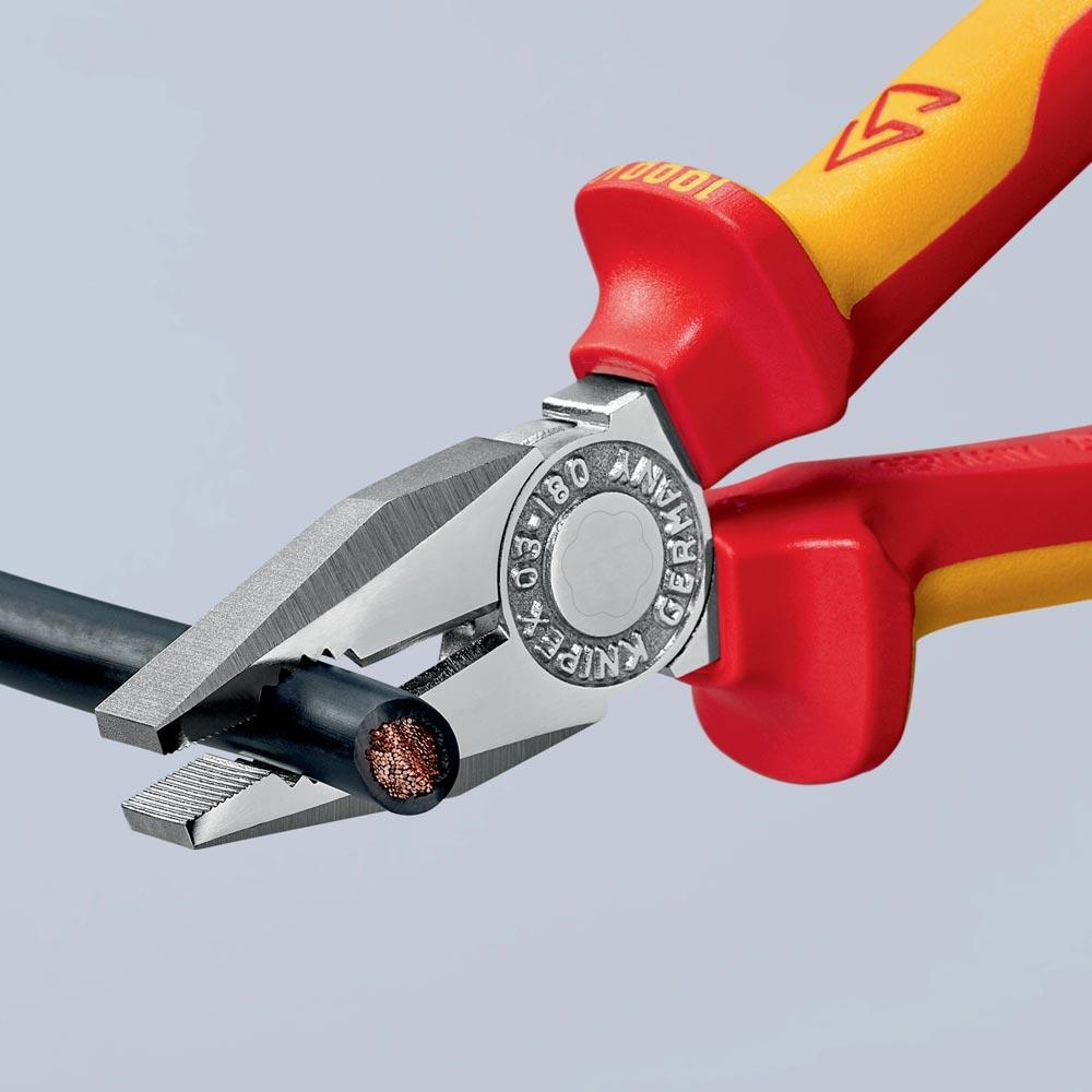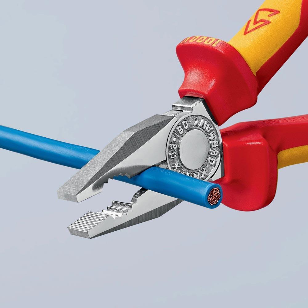 VDE-isoliert bis 1000 V · gefertigt gem. DIN EN/IEC 60900, stückgeprüft · Greifzonen für Flach- und Rundmaterial · lange Schneiden für dickere Kabel · Schneiden zusätzlich induktiv gehärtet, Schneidenhärte ca. 60 HRC · Spezial-Werkzeugstahl, geschmiedet, mehrstufig ölgehärtet