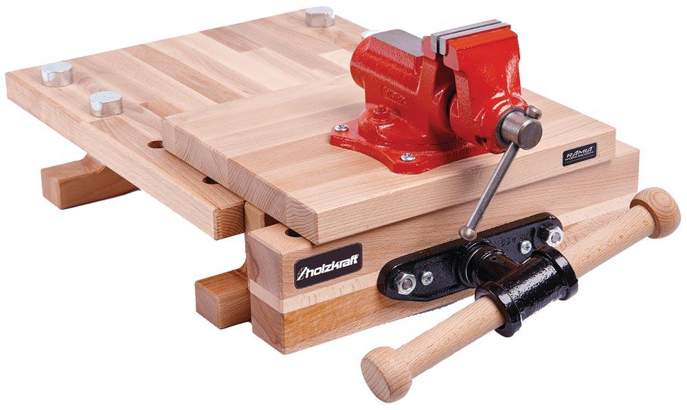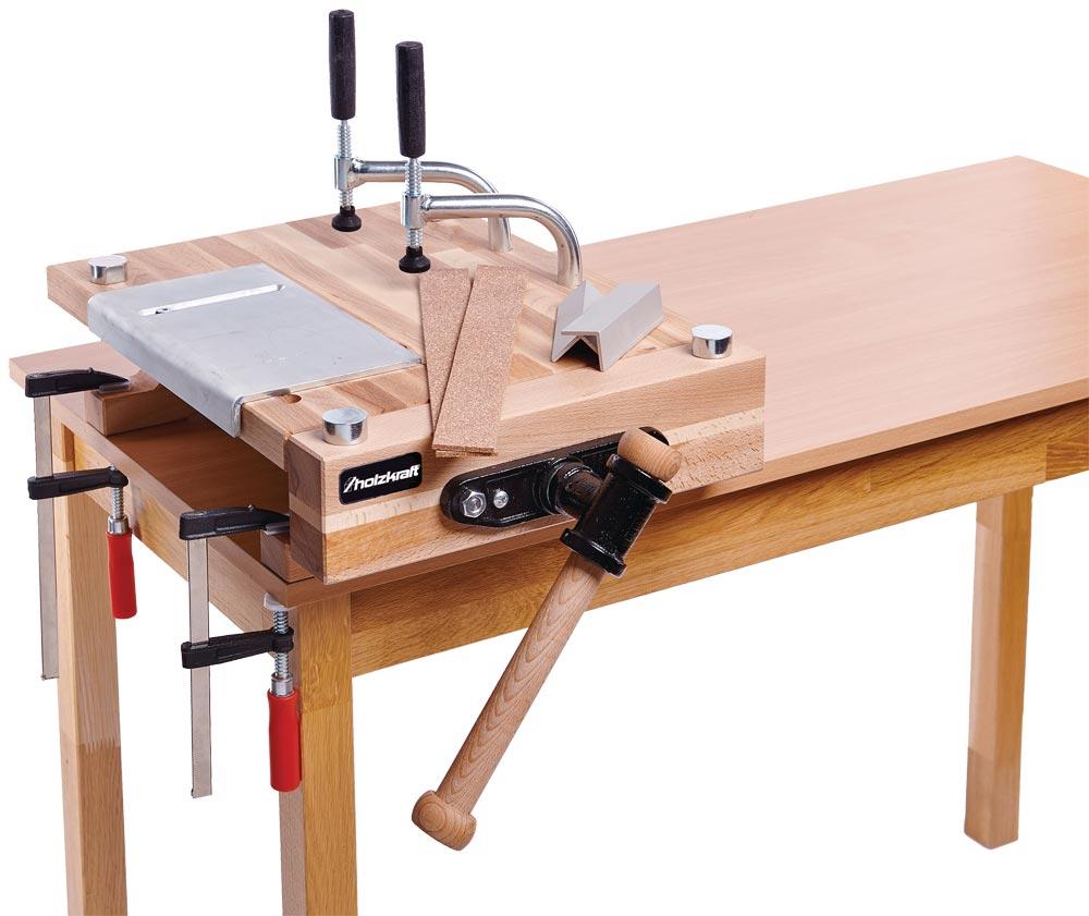 Mobile Kompakt-Hobelbank für den variablen Einsatz ∙ Schnelle und einfache Montage an jedem Tisch durch Klemmung der Standfüße ∙ Massive, keilgezinkte Buchenholz-Arbeitsplatte ∙ Präzise Vorderzange mit doppelten Führungsstangen ∙ 19 mm Lochsystem für vielseitige Spannmöglichkeiten