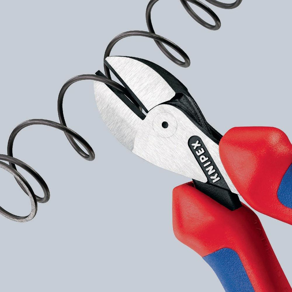 40 % Kraftersparnis gegenüber herkömmlichen Seitenschneider · doppelt gelagerte Gelenkachse · durchgestecktes Gelenk · für alle Drahtsorten einschließlich Pianodraht · auch für dünne Cu-Drähte · große Öffnungsweite für dickere Kabel · kompakte, gewichtssparende Bauweise · Chrom-Vanadin-Hochleistungsstahl, geschmiedet, mehrstufig ölgehärtet