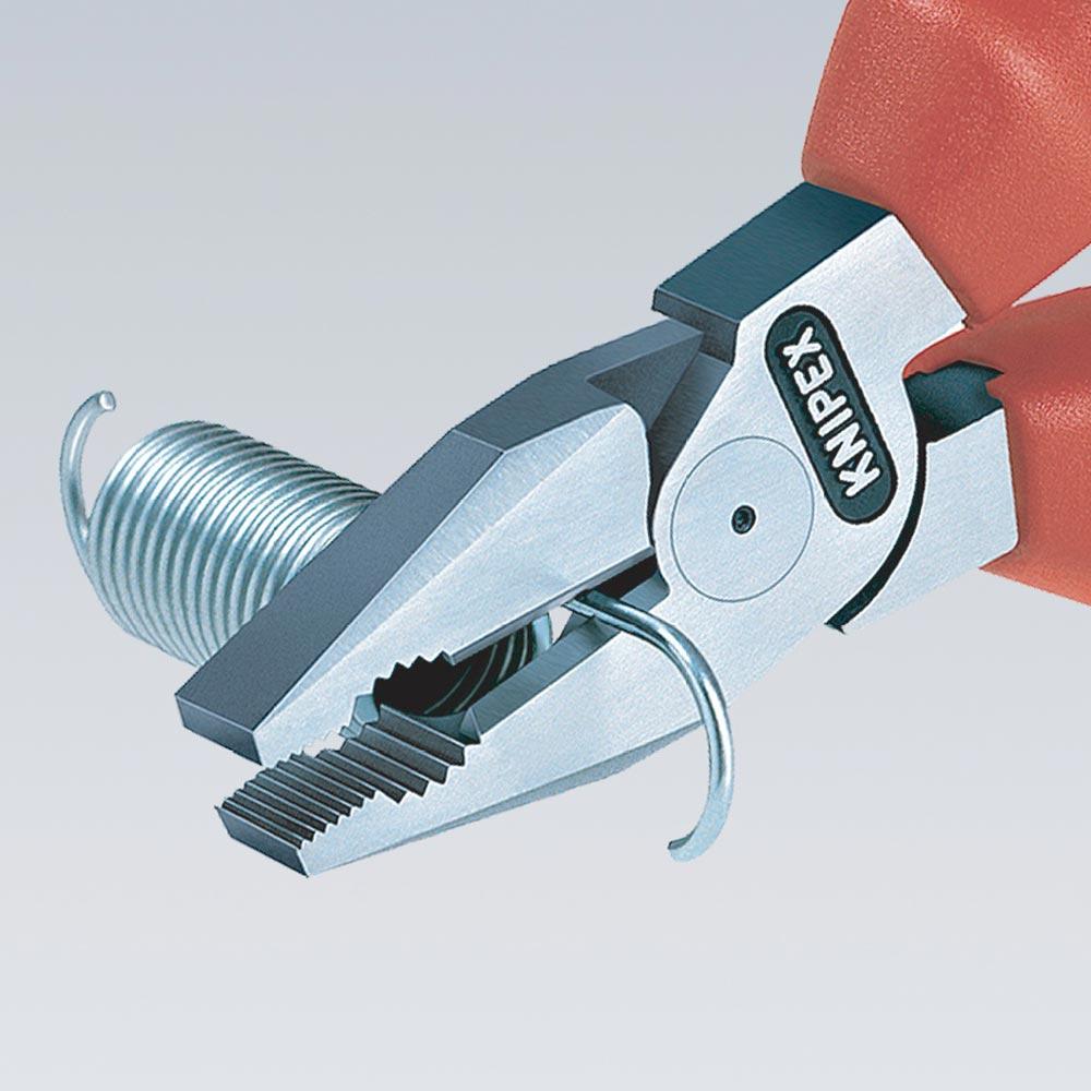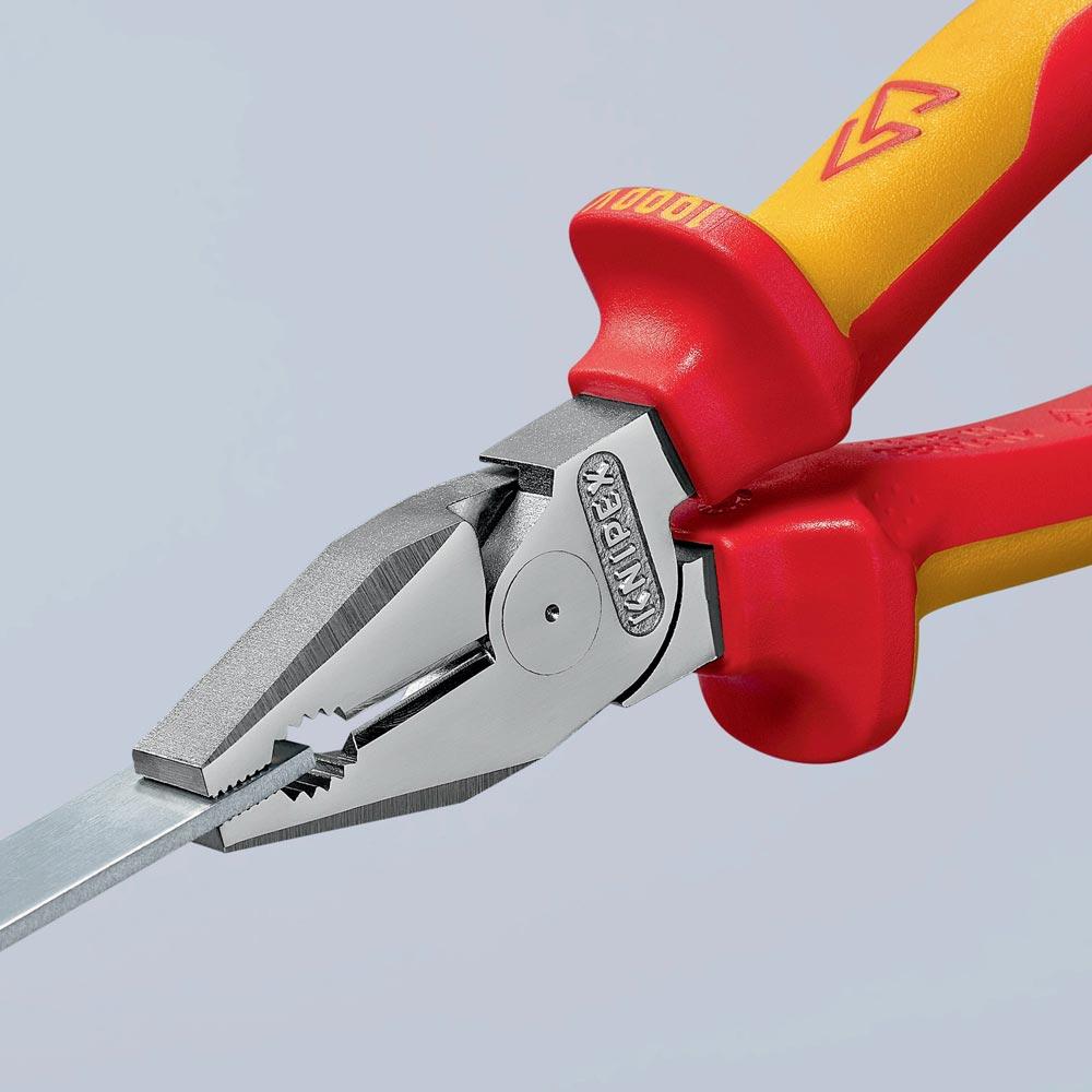 VDE-isoliert bis 1000 V · gefertigt gem. DIN EN/IEC 60900, stückgeprüft · 35 % Kraftersparnis gegenüber herkömmlichen Kombizangen · Greifzonen für Flach- und Rundmaterial · lange Schneiden für dickere Kabel · Schneiden zusätzlich gehärtet, Schneidenhärte ca. 63 HRC · Spezial-Werkzeugstahl in Sondergüte, geschmiedet, mehrstufig ölgehärtet