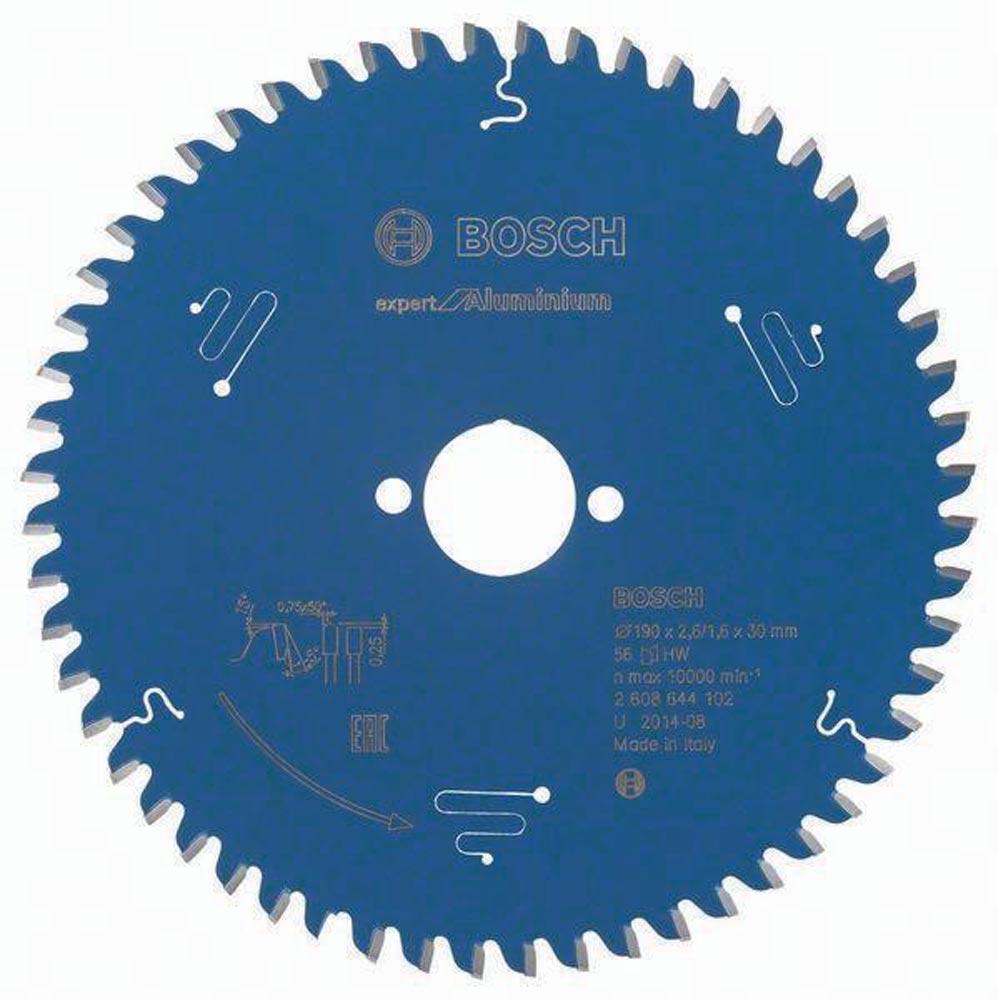 Kreissägeblatt Expert for Aluminium für Tauch- und Handkreissägen. Außendurchmesser: 190 mm · Bohrung: 30 mm · Schnittbreite: 2,6 mm · Stammblattstärke: 1,6 mm · Zähnezahl: 56. Das Expert for Aluminium Kreissägeblatt macht perfekte Schnitte in Nichteisenmetalle wie Aluminium. Auch geeignet zum Schneiden von Kunststoffen und Epoxy · rohen Spanplatten · Akustikplatten · Leichtbauplatten · abrasive ein- oder zweiseitig beschichtete Plattenwerkstoffe sowie Faserwerkstoffe wie MDF- und OSB-Platten. Einzigartige besonders harte Microteq-Zähne · die von Bosch intern produziert werden · werden aus sehr feinem Hartmetallkorn hergestellt · wodurch die Lebensdauer und Leistung des Blatts maximiert wird. Diese Leistung wird durch die Schutzbeschichtung des Blatts unterstützt · die Korrosion verhindert und zuverlässiges Schneiden ermöglicht · während Reibung reduziert wird. Das Produkt ist mit Dämpfungsschlitzen für einen besonders ruhigen Lauf · deutlich weniger Geräusche und spürbar geringere Vibration ausgestattet. Die Verwendung des Universalschneidöls 2 607 001 409 erhöht die Standzeit bei Schnitten in Metall · z. B. Aluminium · um ein Mehrfaches.