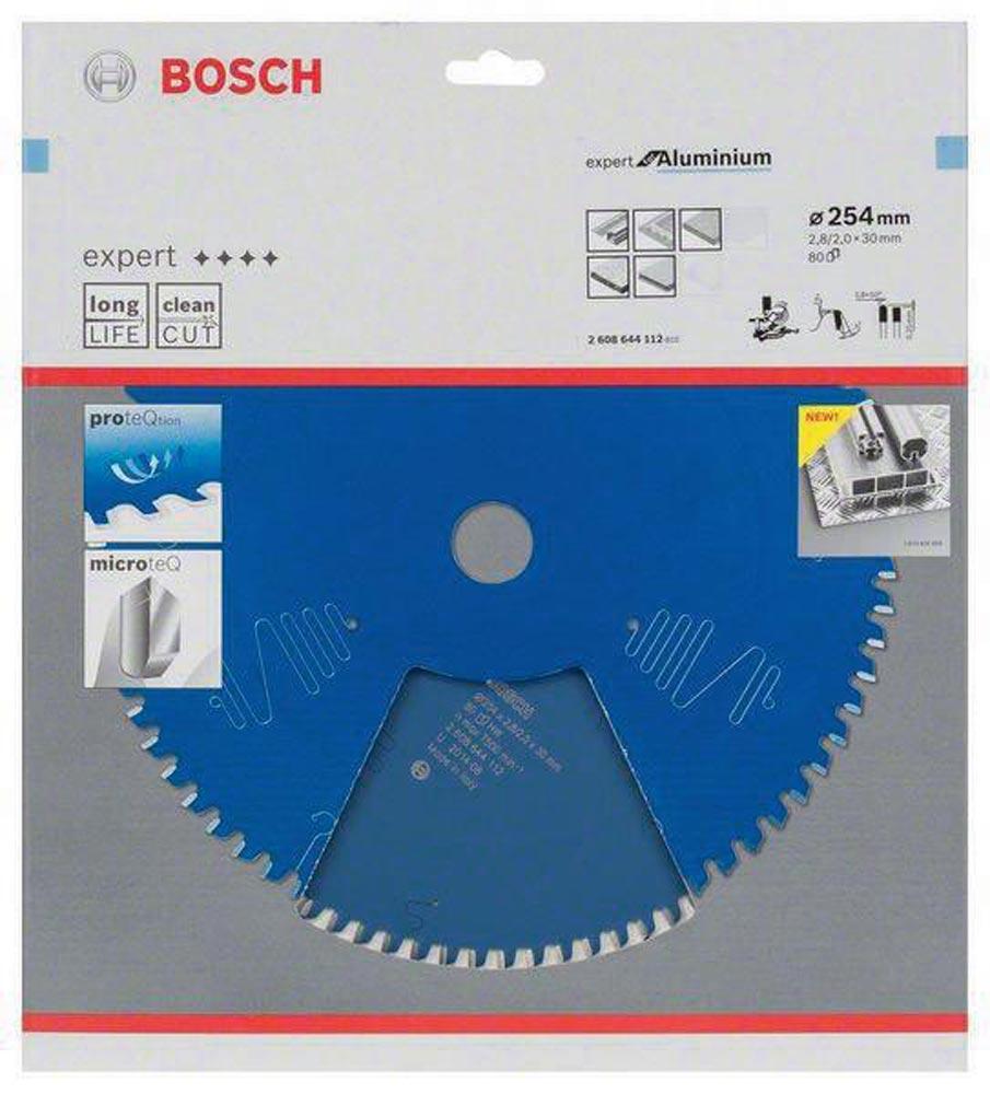 Kreissägeblatt Expert for Aluminium für Kapp- · Gehrungs- und Paneelsägen. Außendurchmesser: 254 mm · Bohrung: 30 mm · Schnittbreite: 2,8 mm · Stammblattstärke: 2,0 mm · Zähnezahl: 80. Das Expert for Aluminium Kreissägeblatt macht perfekte Schnitte in Nichteisenmetalle wie Aluminium. Auch geeignet zum Schneiden von Kunststoffen und Epoxy · rohen Spanplatten · Akustikplatten · Leichtbauplatten · abrasive ein- oder zweiseitig beschichtete Plattenwerkstoffe sowie Faserwerkstoffe wie MDF- und OSB-Platten. Einzigartige besonders harte Microteq-Zähne · die von Bosch intern produziert werden · werden aus sehr feinem Hartmetallkorn hergestellt · wodurch die Lebensdauer und Leistung des Blatts maximiert wird. Diese Leistung wird durch die Schutzbeschichtung des Blatts unterstützt · die Korrosion verhindert und zuverlässiges Schneiden ermöglicht · während Reibung reduziert wird. Das Produkt ist mit Dämpfungsschlitzen für einen besonders ruhigen Lauf · deutlich weniger Geräusche und spürbar geringere Vibration ausgestattet. Die Verwendung des Universalschneidöls 2 607 001 409 erhöht die Standzeit bei Schnitten in Metall · z. B. Aluminium · um ein Mehrfaches.