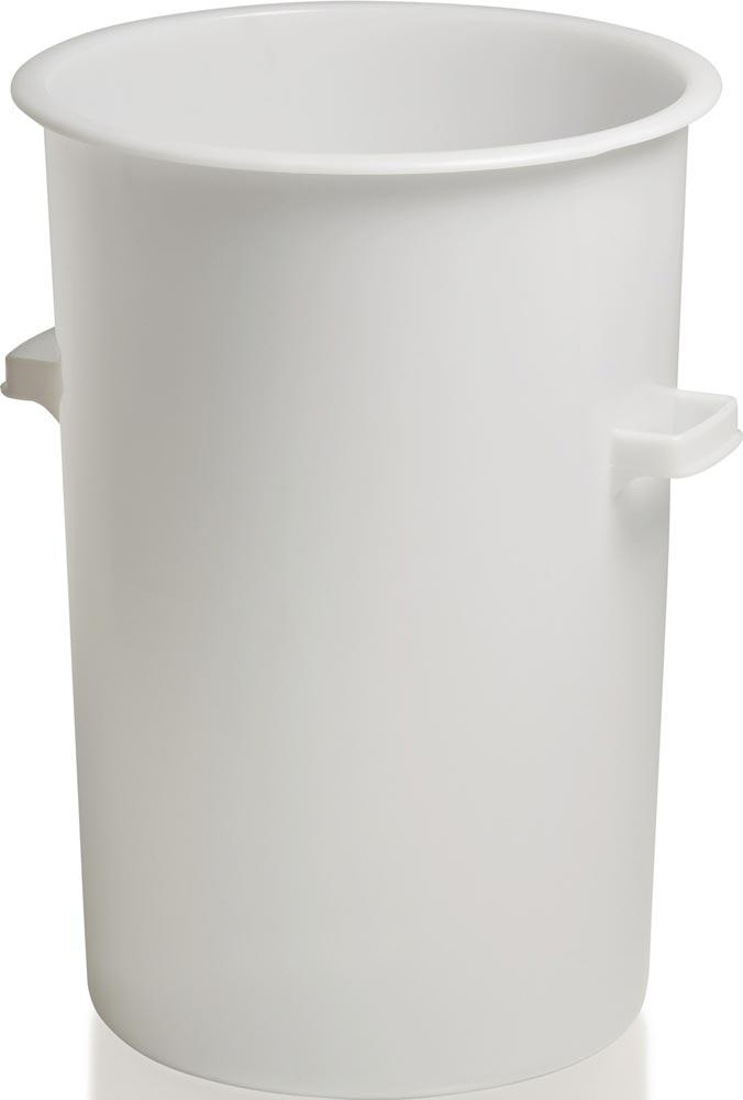 HD-Polyethylen · rund · mit 2 Außengriffen · leer ineinander stapelbar · mittels Spezialdeckel auch aufeinander stapelbar · die Behälter sind formstabil, leicht zu reinigen und auch bei tiefsten Temperaturen bruchfest · temperaturbeständig von -30 °C bis +40 °C (kurzfristig bis +90 °C) · lebensmittelecht · Farbe weiß
