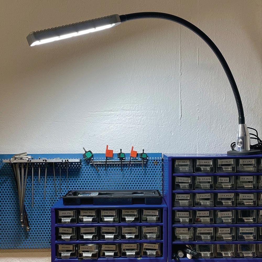 Hochleistungs-LED im Aluminiumgehäuse, mit Flexwelle und gummiummanteltem Magnetfuß · blend- und flackerfrei · gleichmäßige, reflexionsarme 105° Ausleuchtung, 90x70cm Lichtkegel bei 40cm Entfernung · Gesamtlänge 850mm · Diese Leuchte enthält eingebaute LED-Leuchtmittel. Die eingebauten Leuchtmittel können nur durch den Hersteller ausgetauscht werden.