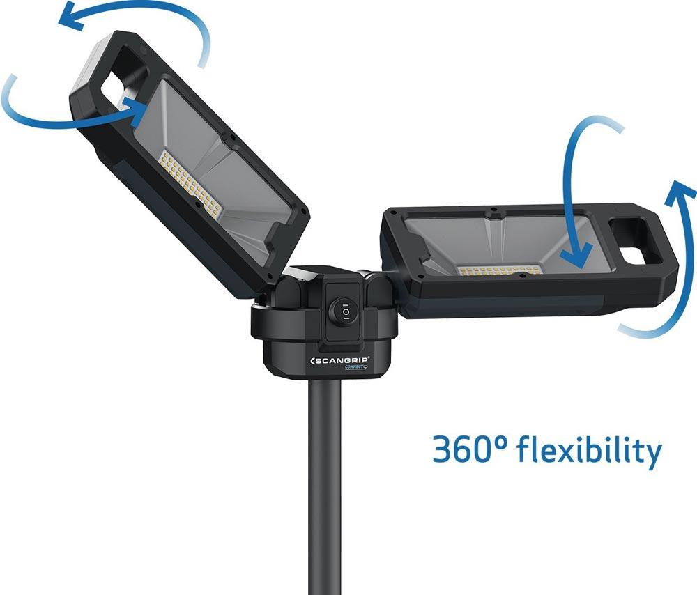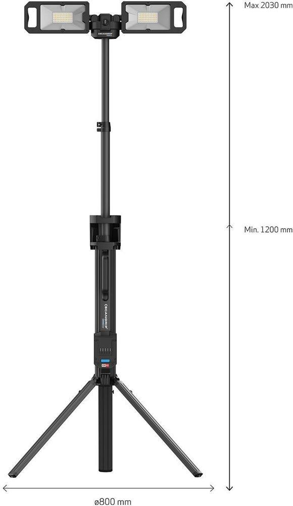 Baustrahler mit 5000 Lumen und integriertem Stativ für 18-V-Akkupacks · zwei eingebaute Flutlichtstrahler · um 360° drehbar · SCHNELLFALTSYSTEM · Gewicht 5,2 kg