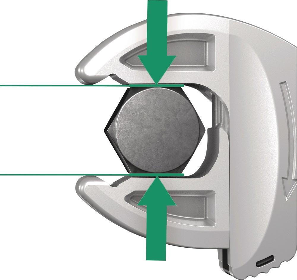 Besondere Produktvorteile: automatisch stufenlos zugreifend · schraubenschonend (glatte Backen) · Ratschenfunktion (durchgängiges Schrauben ohne Absetzen) · kleiner Rückschwenkwinkel von nur 30°