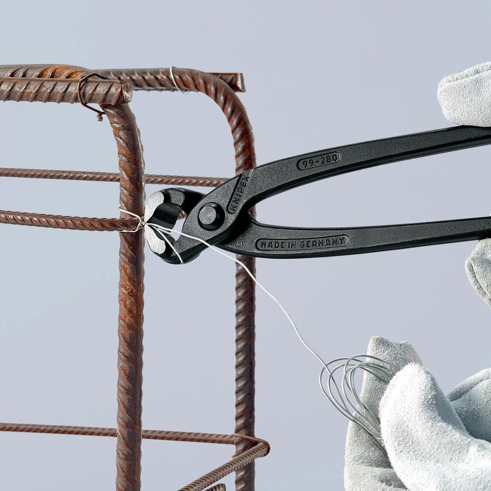 (Rabitz- oder Flechterzange) · zum Verdrillen und Schneiden von Bindedraht von der Rolle in einem Arbeitsgang · Schneiden zusätzlich gehärtet, Schneidenhärte ca. 61 HRC · Spezial-Werkzeugstahl in Sondergüte, geschmiedet, mehrstufig ölgehärtet