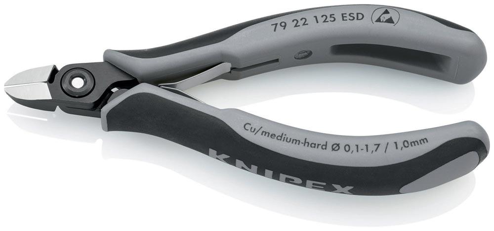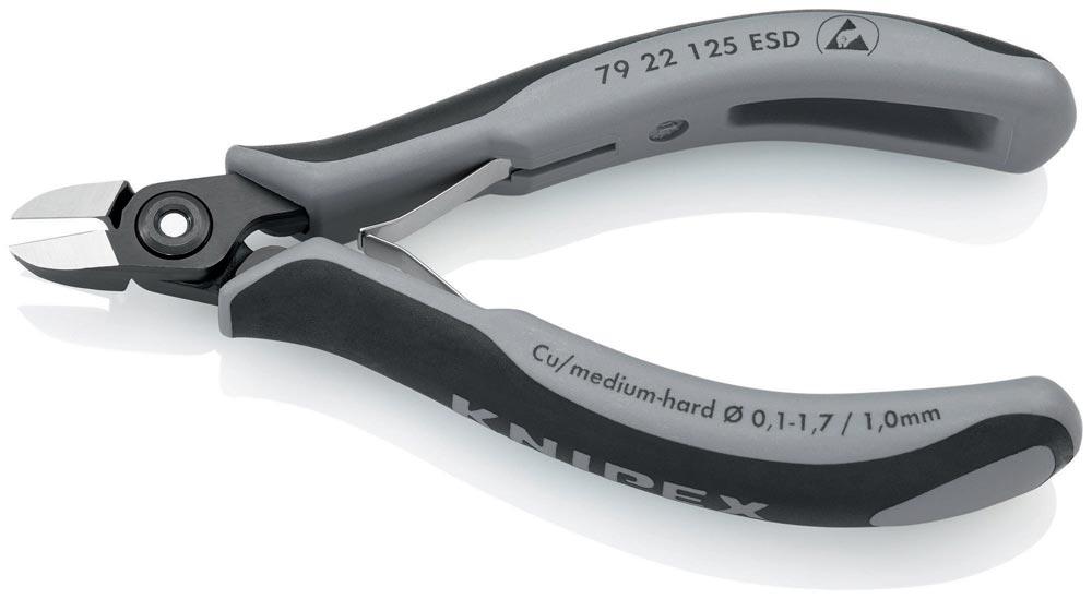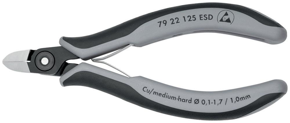 ESD · für feinste Schneidarbeiten z. B. in Elektronik und Feinmechanik · geschliffene, scharfe Schneiden · Schneiden zusätzlich induktiv gehärtet, Schneidenhärte ca. min. 64 HRC · ca. 20% weniger Gewicht · geschraubtes Gelenk · Öffnungsfeder · Chrom-Vanadin-Kugellagerstahl, geschmiedet, mehrstufig ölgehärtet · elektrisch ableitend - dissipativ