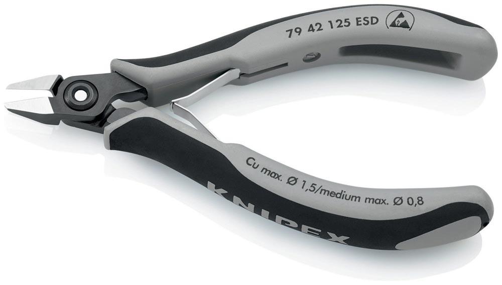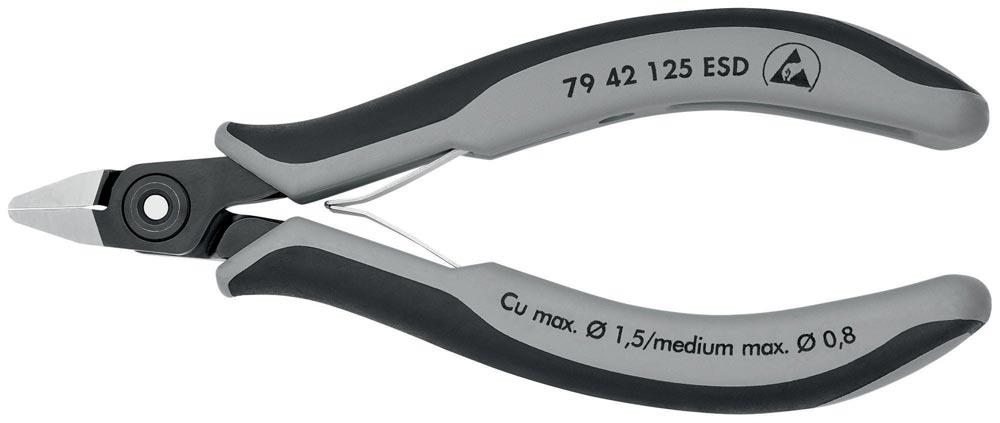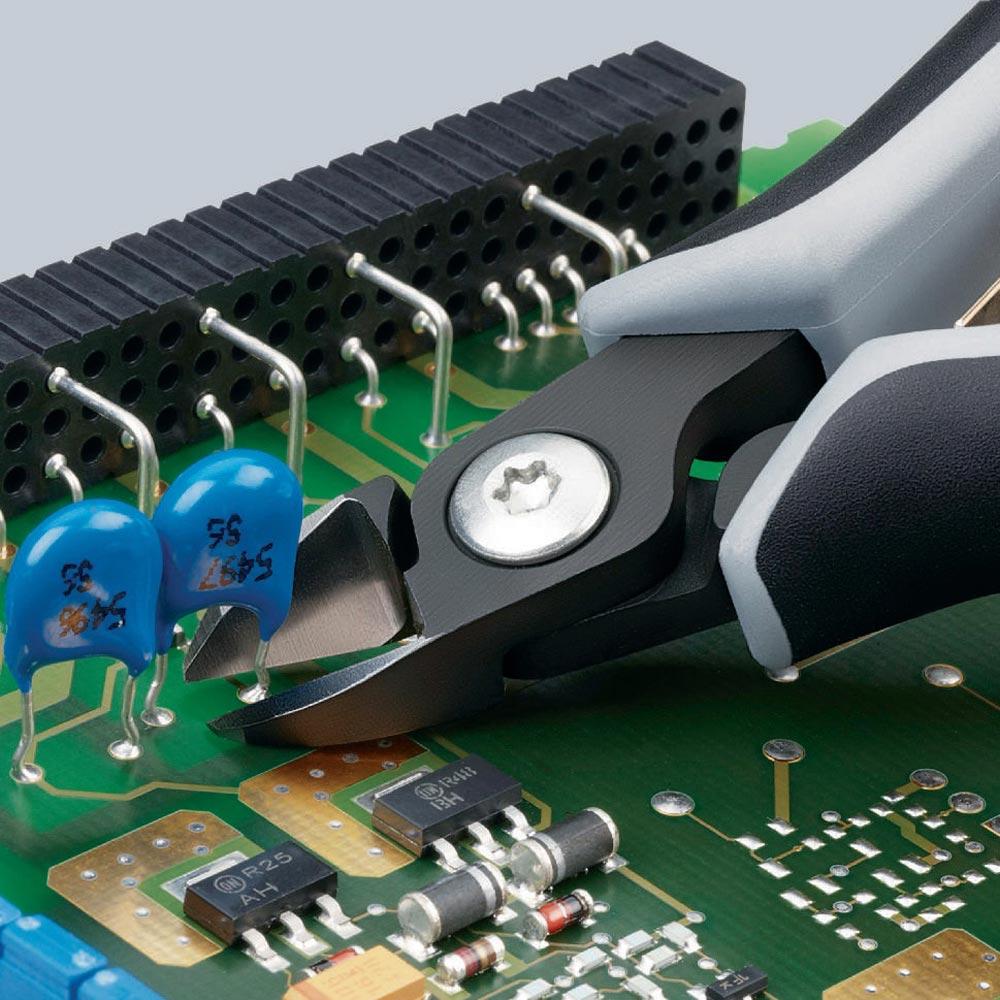 ESD · für feinste Schneidarbeiten z. B. in Elektronik und Feinmechanik · geschliffene, scharfe Schneiden · Schneiden zusätzlich induktiv gehärtet, Schneidenhärte ca. min. 64 HRC · ca. 20% weniger Gewicht · geschraubtes Gelenk · Öffnungsfeder · Chrom-Vanadin-Kugellagerstahl, geschmiedet, mehrstufig ölgehärtet · elektrisch ableitend - dissipativ