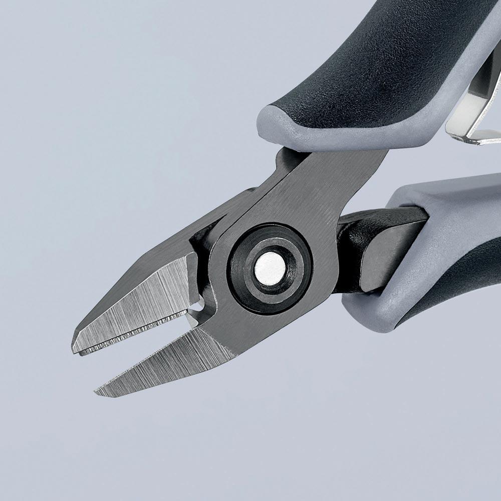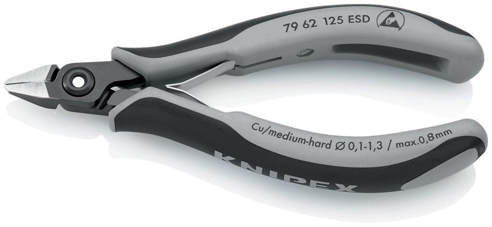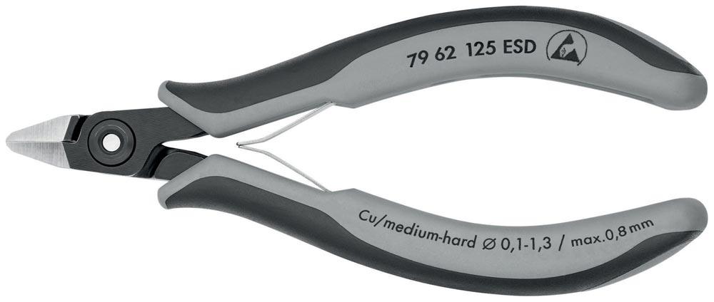 ESD · für feinste Schneidarbeiten z. B. in Elektronik und Feinmechanik · geschliffene, scharfe Schneiden · Schneiden zusätzlich induktiv gehärtet, Schneidenhärte ca. min. 64 HRC · ca. 20% weniger Gewicht · geschraubtes Gelenk · Öffnungsfeder · Chrom-Vanadin-Kugellagerstahl, geschmiedet, mehrstufig ölgehärtet · elektrisch ableitend - dissipativ