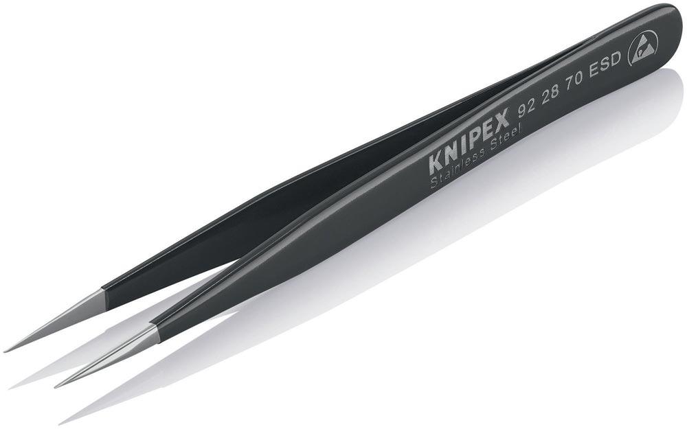 ESD-Beschichtung: blendfrei schwarz, mit einem Oberflächenwiderstand von ca. 105 Ohm · Spitzen blendfrei gebürstet · Greifflächen mattiert für optimalen Halt · Chrom-Nickel-Stahl, rostfrei, antimagnetisch (18/10)