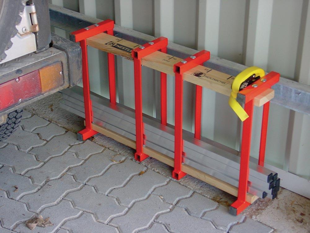ofenfertige Scheite von 25, 33 oder 50 cm sicher sägen · kann mit wenigen Handgriffen so zerlegt werden, dass er in jedem Kofferraum mitgeführt werden kann · Aufnahme Raummeter 0,33 Ster · steckbare Rungenstangen aus Aluminium · mitgeliefertes Ratschenband zur Sicherung der Beladung des Sägebocks
