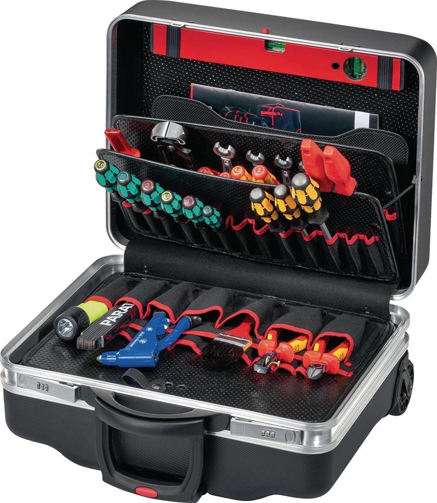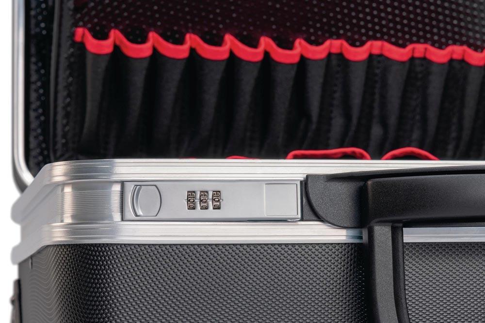 Doppel-Aluminiumrahmen · robuste, rutschfeste X-ABS Außenschale · bis zu 50 Werkzeuge lassen sich in zwei Werkzeugtafeln sicher verstauen · frei unterteilbare, mit 88 mm extratiefe Bodenschale · mit Wasserwaagen-Halterung sowie Visitenkartenfächer, Stiftschlaufen und Dokumentenfach im Kofferdeckel · bis zu 30 kg belastbar · 4-fach-Teleskopauszug · große Leichtlaufrollen · Rasterscharniere mit praktischer Kofferdeckelarretierung