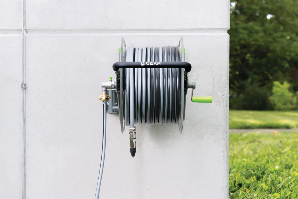 lässt sich stationär ebenso wie mobil einsetzen · montieren Sie den GEKA P40 an der Wand und nehmen Sie ihn bei Bedarf einfach ab, um ihn an den gewünschten Einsatzort zu bringen · schwenkbar · sowohl links- als auch rechtsseitig montierbar · 4-Stufen arretierbar · robuste, pulverbeschichtete Stahlkonstruktion · Winkeldreharmatur aus Messing · für Trinkwasser geeignet · Schutz vor Schlauchknick durch Zulaufrohr 3/4" (aus Edelstahl, für Trinkwasser geeignet) · schlauchschonende Trommel · optimaler Wasserdurchlauf · Temperaturbereich: +4 °C bis +60 °C