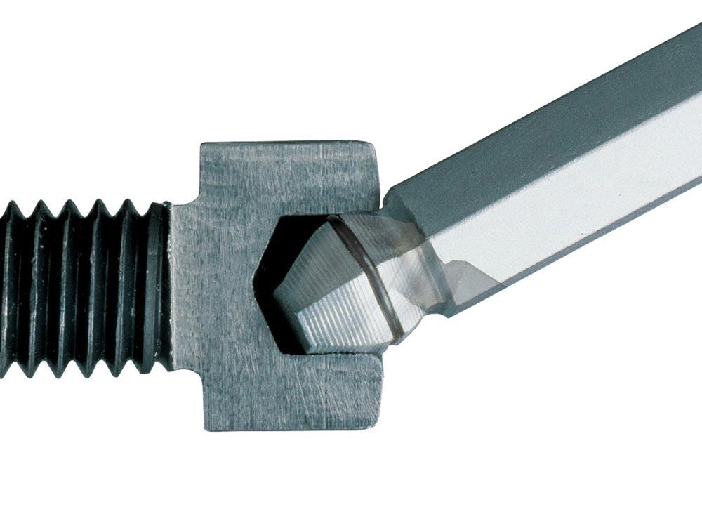 extra lang · mit Kugelkopf und Haltering für die Schraube · Chrom-Vanadium-Stahl · verchromt · abgewinkelt · langer Schenkel mit Kugelkopf und Haltering · der Kugelkopf ermöglicht ein Schrauben bis zu einem Winkel von 25° · der Haltering verhindert das Herunterfallen der Schraube · kurzer Schenkel gefast