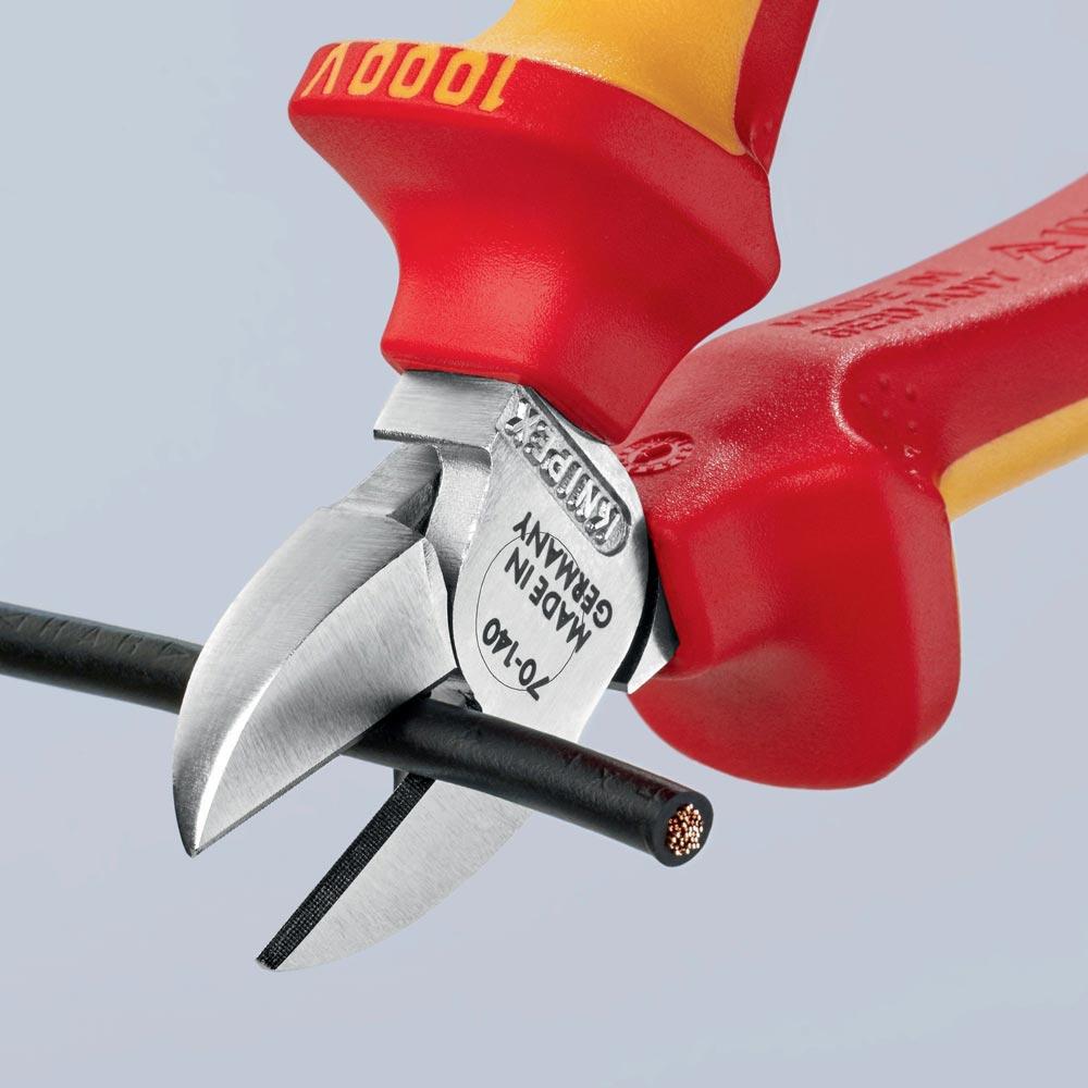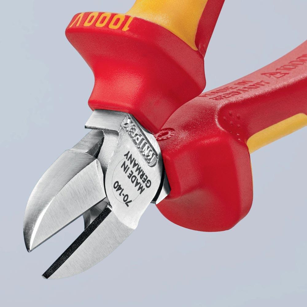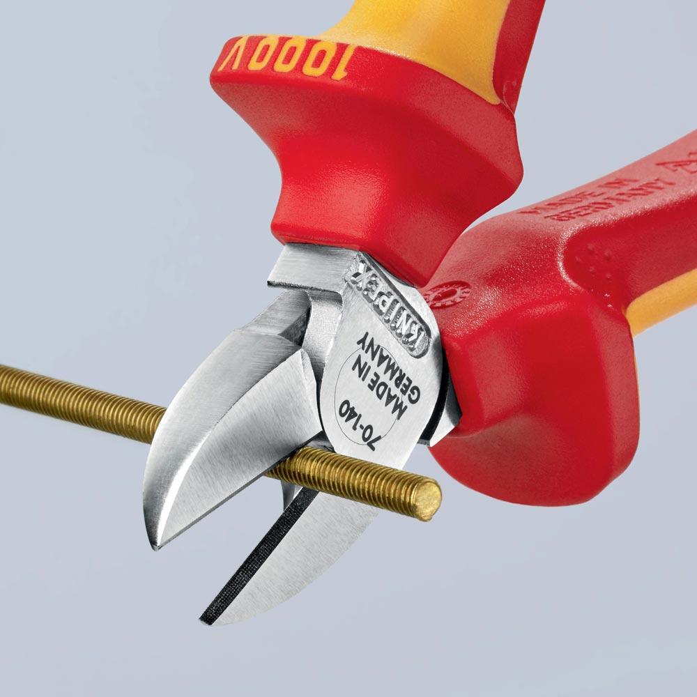 VDE-isoliert bis 1000 V · gefertigt gem. DIN EN/IEC 60900, stückgeprüft · schlanke Kopfform · sauberer Schnitt bei dünnen Cu-Drähten, auch an den Schneidenspitzen · Schneiden zusätzlich gehärtet, Schneidenhärte ca. 62 HRC · Vanadin-Elektrostahl, geschmiedet, mehrstufig ölgehärtet