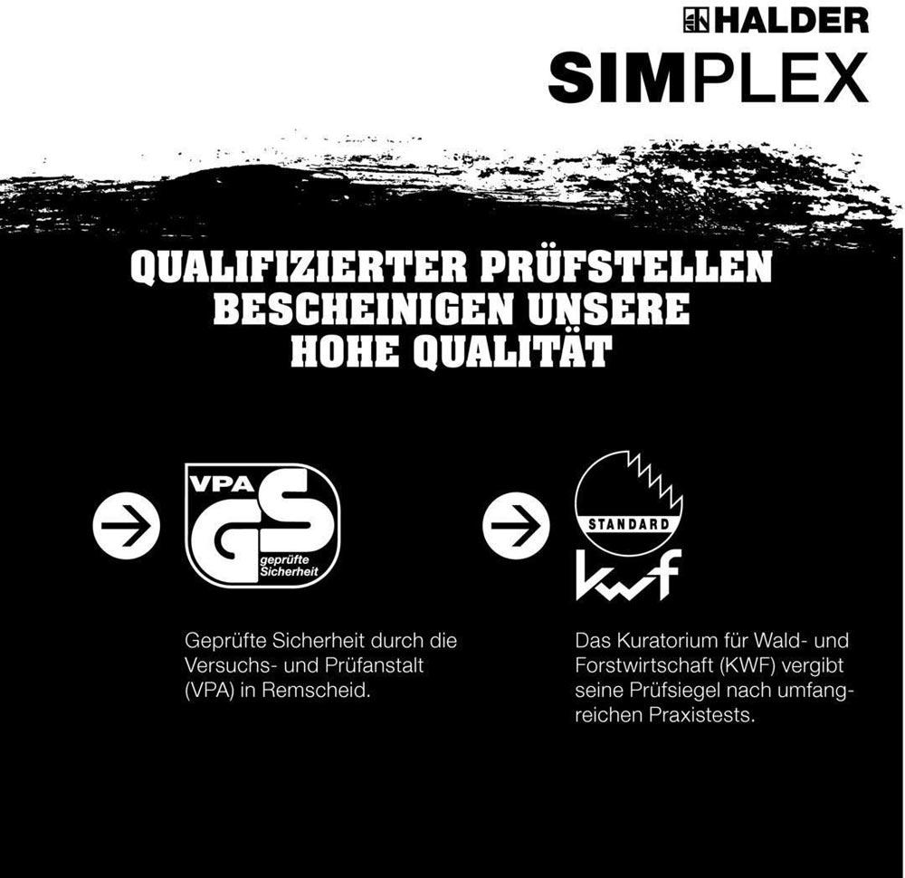 Der SIMPLEX-Spalthammer von Halder vereint zwei Werkzeuge in Einem · einen Spalthammer und einen Schonhammer in absoluter Profiqualität und bietet somit eine erhebliche Kostenersparnis gegenüber dem Einzelkauf. Die hohe Produktqualität ist vom Kuratorium für Waldarbeit und Forsttechnik (KWF) attestiert. Der aus hochwertigem Carbonstahl geschmiedete Spalteinsatz sorgt aufgrund seiner Wendenase für eine extrem gute Spaltwirkung. Diese wird durch 4.100g Gesamtgewicht und eine hohe Kopflastigkeit zusätzlich unterstützt. Der Superplastik-Einsatz mit D60mm ist ein mittelharter Kunststoff-Einsatz aus extrudiertem · extrem homogenem Material. Im Vergleich zu gespritzten Plastik-Einsätzen ist er dadurch wesentlich verschleißfester und widerstandsfähiger. Durch den Einsatz dieser Schonseite bei Keilarbeiten wird die Verletzungsgefahr durch Metallsplitter komplett vermieden · Kunststoff- und Aluminiumkeile haben eine wesentlich höhere Lebensdauer. Das Gehäuse aus Temperguss besitzt eine integrierte Stielschutzhülse · die für eine hohe Bruchsicherheit sorgt. Der langfaserige · sehr stabile Hickory-Stiel ist lackiert und ergonomisch geformt. Der Lederschneidschutz schützt beim Transport vor Verletzungen. Gemäß dem cleveren SIMPLEX-Prinzip sind alle Komponenten austauschbar und nachrüstbar. Dies schont nicht nur den Geldbeutel · sondern auch Ressourcen. Produktmerkmale: 2 Werkzeuge in 1: Spalthammer plus Schonhammer · eine erhebliche Kostenersparnis gegenüber dem Einzelkauf. Aus hochwertigem Carbonstahl geschmiedeter Spalteinsatz sorgt aufgrund seiner Wendenase für extrem gute Spaltwirkung. Keine Verletzungsgefahr bei Keilarbeiten durch Metallsplitter aufgrund des Superplastik-Einsatzes in D60mm (weiß · mittelhart · sehr widerstandsfähig). Wesentlich längere Lebensdauer von Kunststoff- und Aluminiumkeilen. Schonendes Einschlagen von Holzpfählen. Gehäuse aus Temperguss mit integrierter Stielschutzhülse und hoher Bruchsicherheit. Langfaseriger · sehr stabiler Hickory-Stiel · lackiert und ergonomisch geformt. Alle Teile sind austauschbar / nachrüstbar · somit sehr wirtschaftlich und Ressourcen schonend. Inkl. Lederschneidschutz. 4.100g Gesamtgewicht. Anwendungsgebiete Motormanuelle Holzernte · sicheres und materialschonendes Einschlagen von Stahlkeilen mit Schoneinsatz · Spalten von Meterholz · Keilarbeiten in der Fällung · schonendes Einschlagen von Holzpfählen · Garten-/Landschaftsbau Werkstoff Stiel Hickory Schlageinsatz 1 Spalteinsatz aus hochwertigem Carbonstahl · gesenkgeschmiedet und vergütet · mit Wendenase inkl. Kunststoffhülse inkl. Lederschneidschutz Schlageinsatz 2 Superplastik · weiß mittelhart sehr widerstandsfähig verschleißfest Gehäuse Temperguss Montage In den SIMPLEX-Spalthammer darf nur der Superplastik-Einsatz 3207.060 montiert werden. Spalteinsatz 3210.160 darf nur in Tempergussgehäuse 3011.160 montiert werden! · Ersatz-Superplastik-Einsätze siehe Art.-Nr. 455693