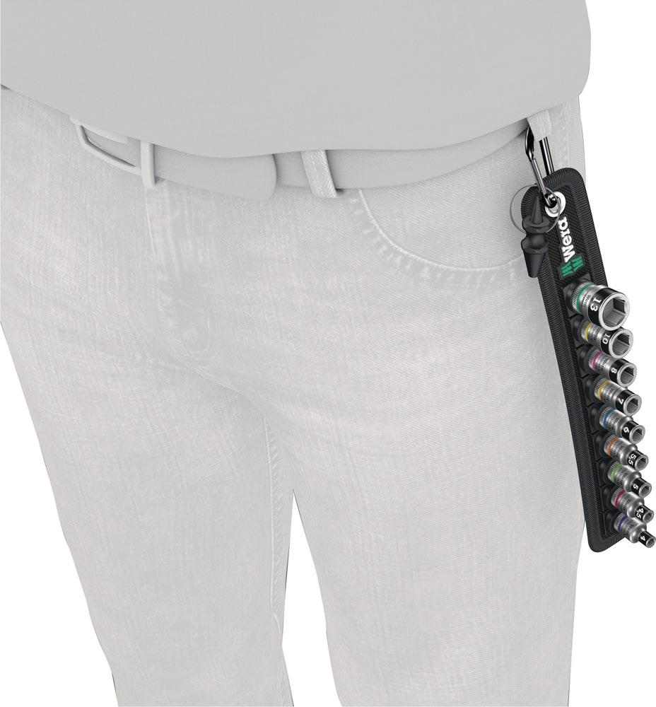 6,3 mm (1/4 ″)-Vierkantantrieb · robuster Textilgurt, inkl. Karabinerhaken · Vliesrücken und Klettklebestreifen zur einfachen Befestigung z. B. am Regal, Werkstattwagen und Wera 2go Werkzeugtransportsystem · leichtgängiger Drehmechanismus für sichere Aufbewahrung und einfache Entnahme