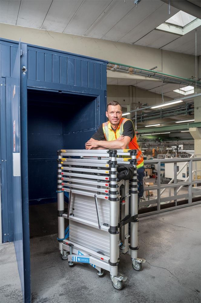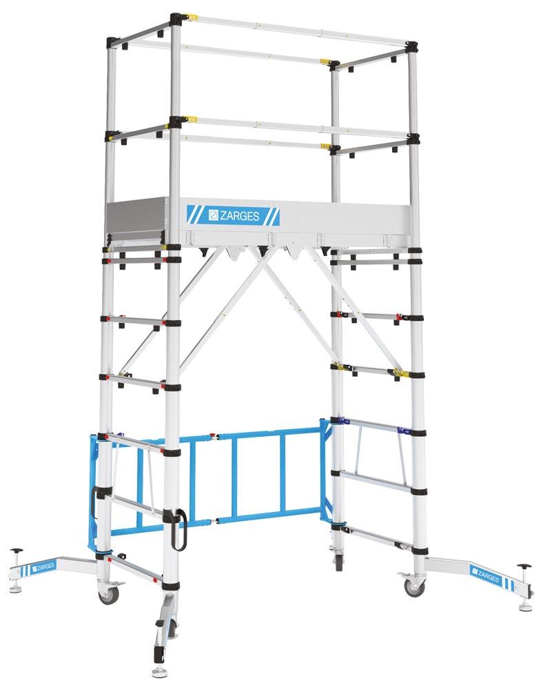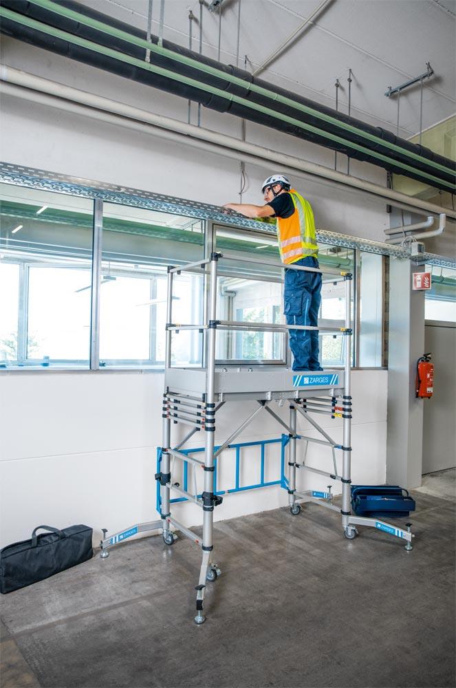 Fahrgerüst mit innovativen Teleskop-Mechanismus für schnellen Auf- und Abbau ∙ Große Aluminium-Plattform mit Durchstieg ∙ Leicht zu transportieren - auch in einem kleinen Transporter bzw. PkW-Kofferraum ∙ Durch eine Person bedienbar ∙ Integrierte Ausleger mit Einrastpositionen für freien sowie wandnahen Stand ∙ Lenkrollen mit Bremsfunktion.
