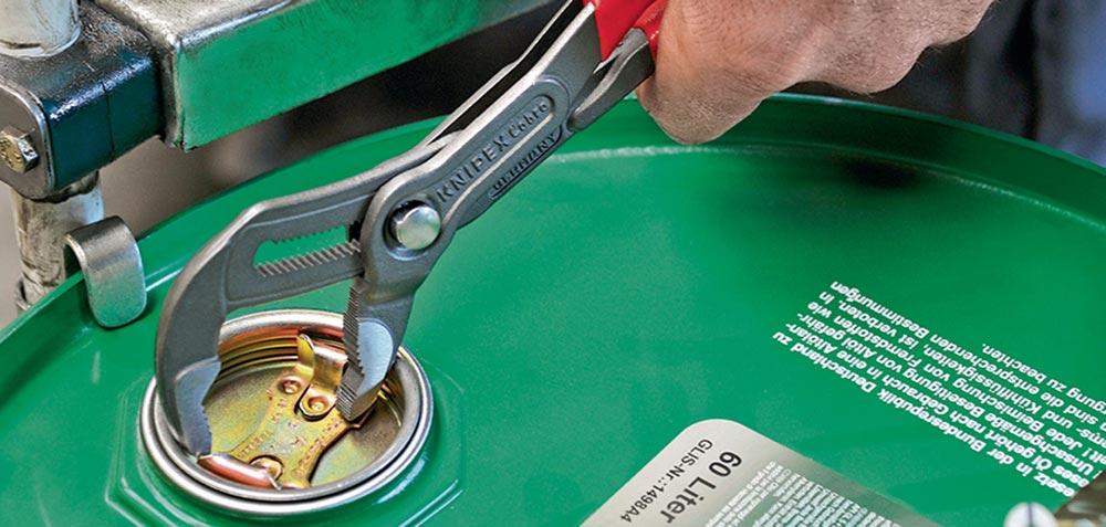 selbstklemmend an Rohren und Muttern · durchgestecktes Gelenk für hohe Stabilität durch doppelte Führung · Einstellung per Knopfdruck direkt am Werkstück · Greifflächen mit spezialgehärteten Zähnen, Härte der Zähne ca. 61 HRC · Klemmschutz · Chrom-Vanadin-Elektrostahl, geschmiedet, mehrstufig ölgehärtet