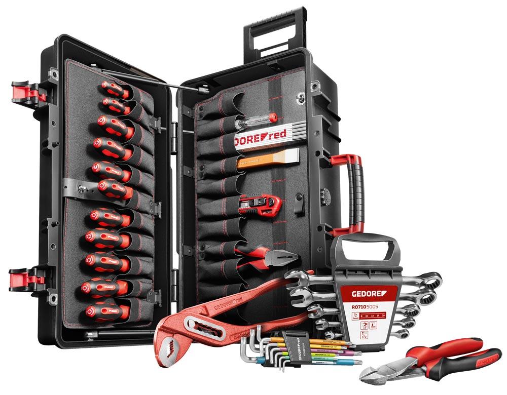 vollständiges Handwerker-Sortiment für Schrauben, Lösen, Schneiden, Messen und viele weitere Aufgaben · ausgestattet mit 2 leichtgängigen Rollen und einrastendem Teleskopgriff
